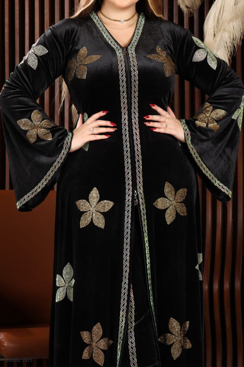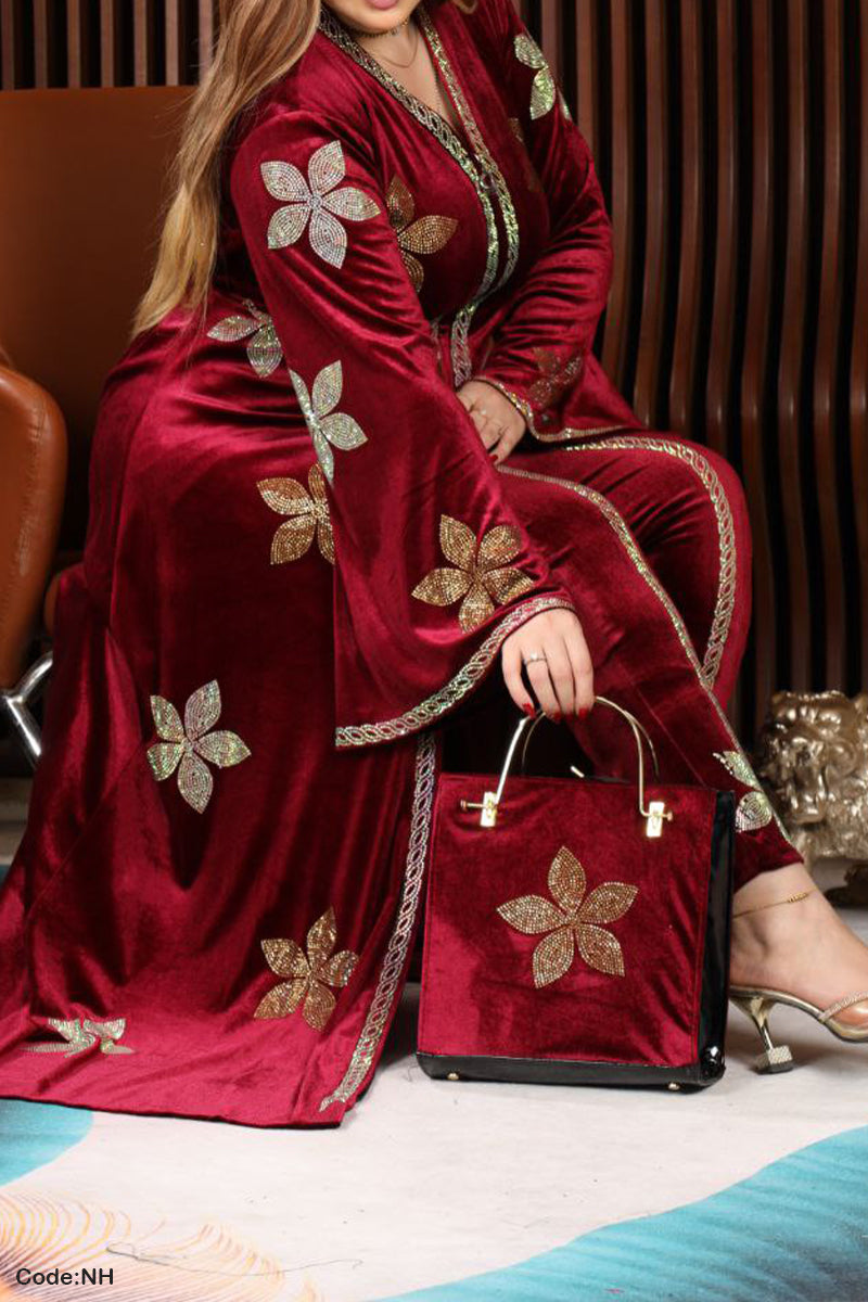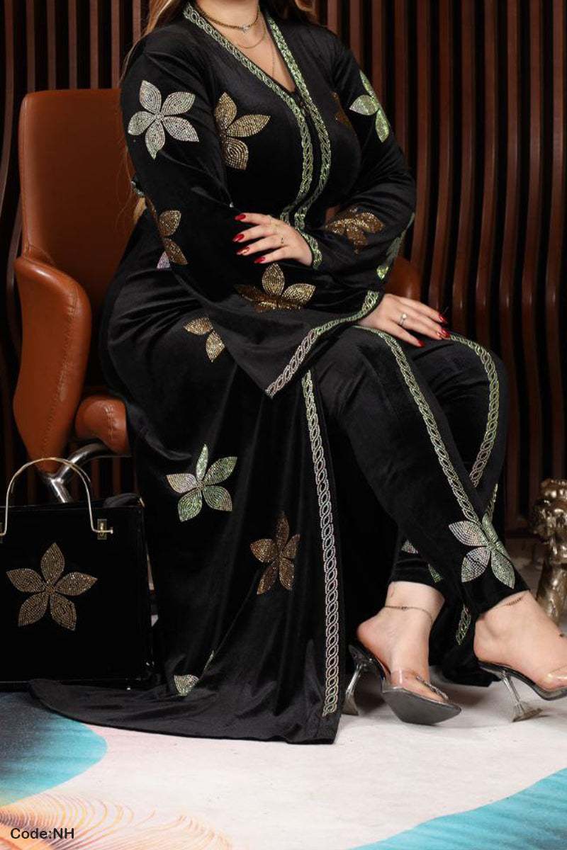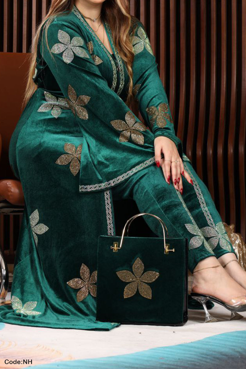 • عباية مكونة من ثلاث قطع (عباية بكم مفتوحه من الامام بسوسته - بنطال من نفس الخامه والتطريز - وحقيبه)