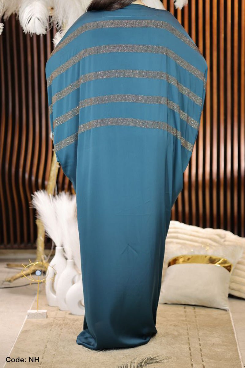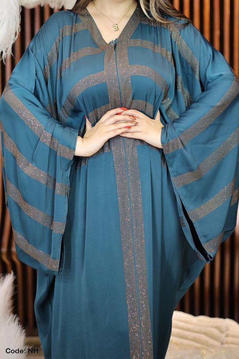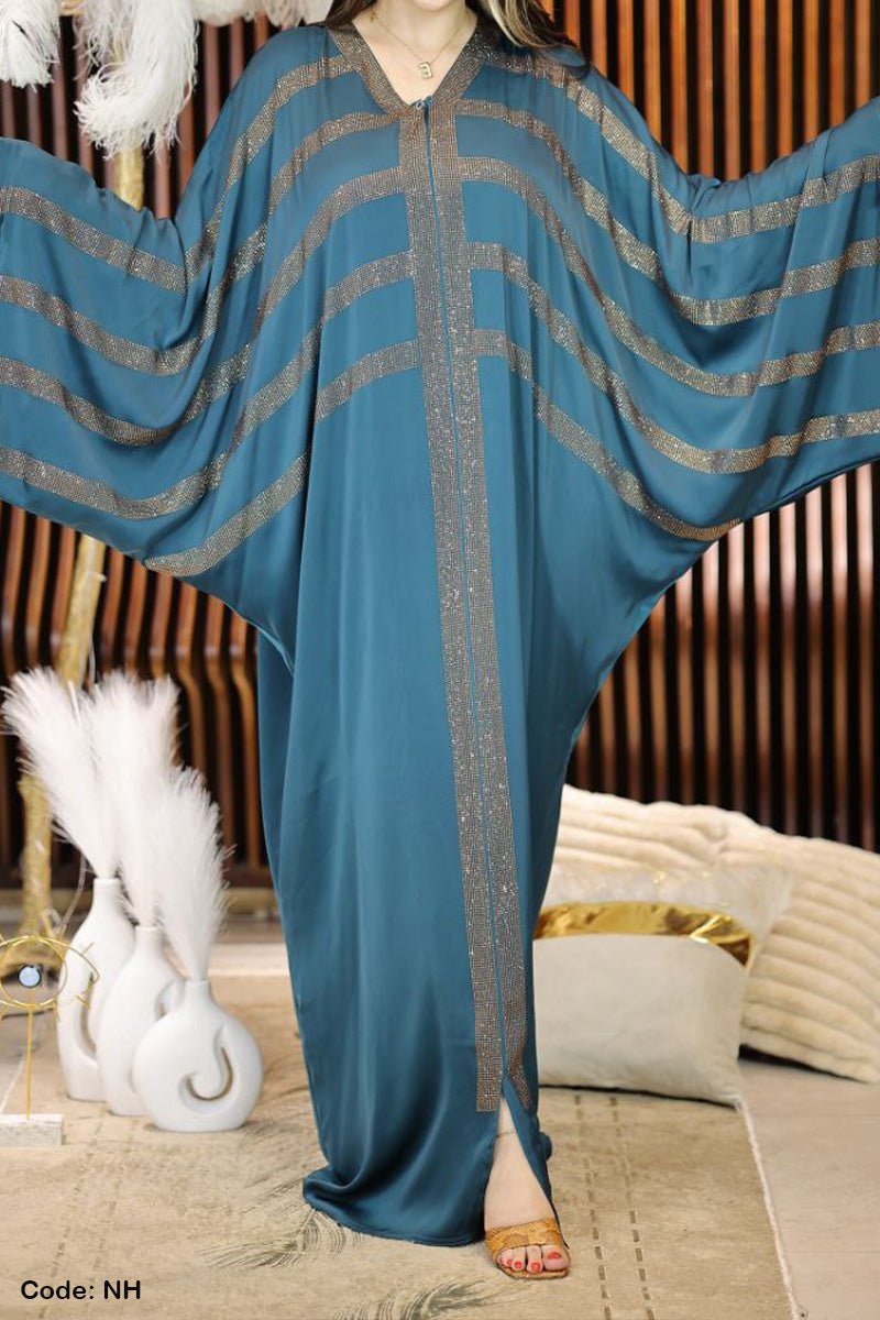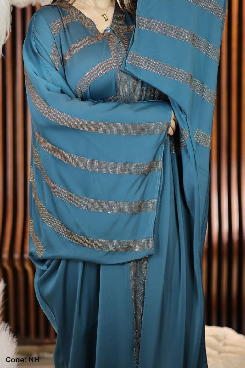 - التطريز: التطريز باستراس وبخيوط لامعة علي الصدر والاكمام وبطول الملحفة