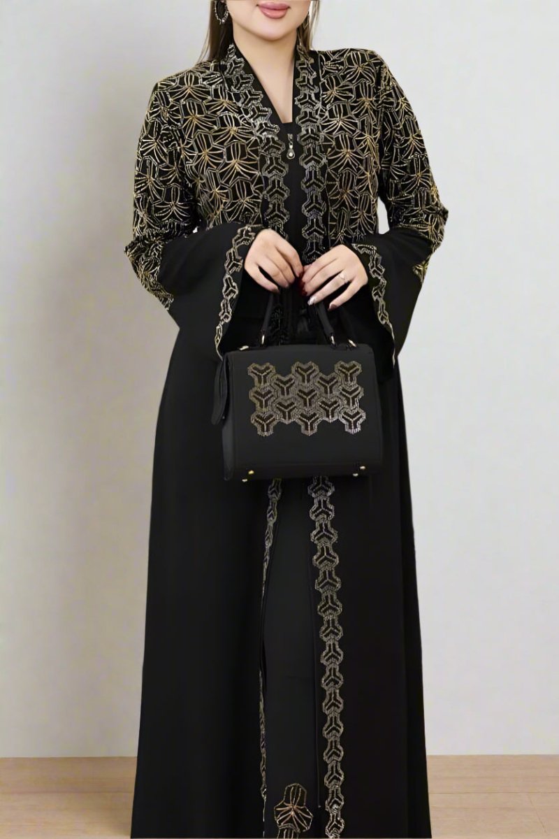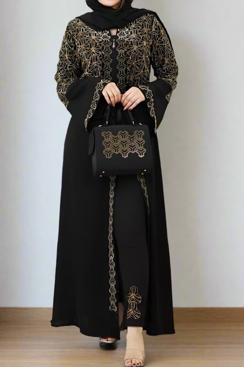 - عباية مكونة من ثلاث قطع عباية مفتوحة وبنطلون وحقيبة