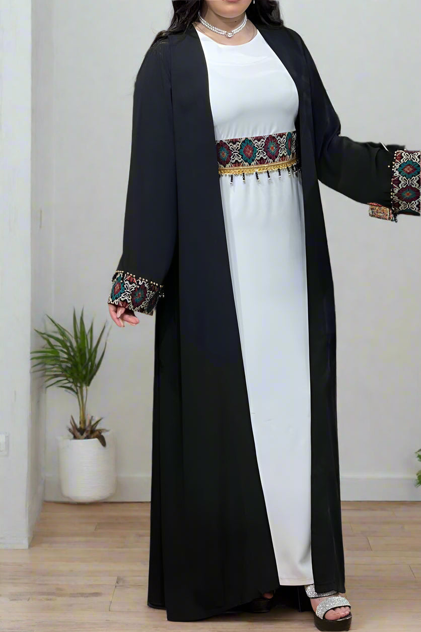 • عباية مكونة من قطعتين بيزك وعباية بكم مفتوحة من الامام