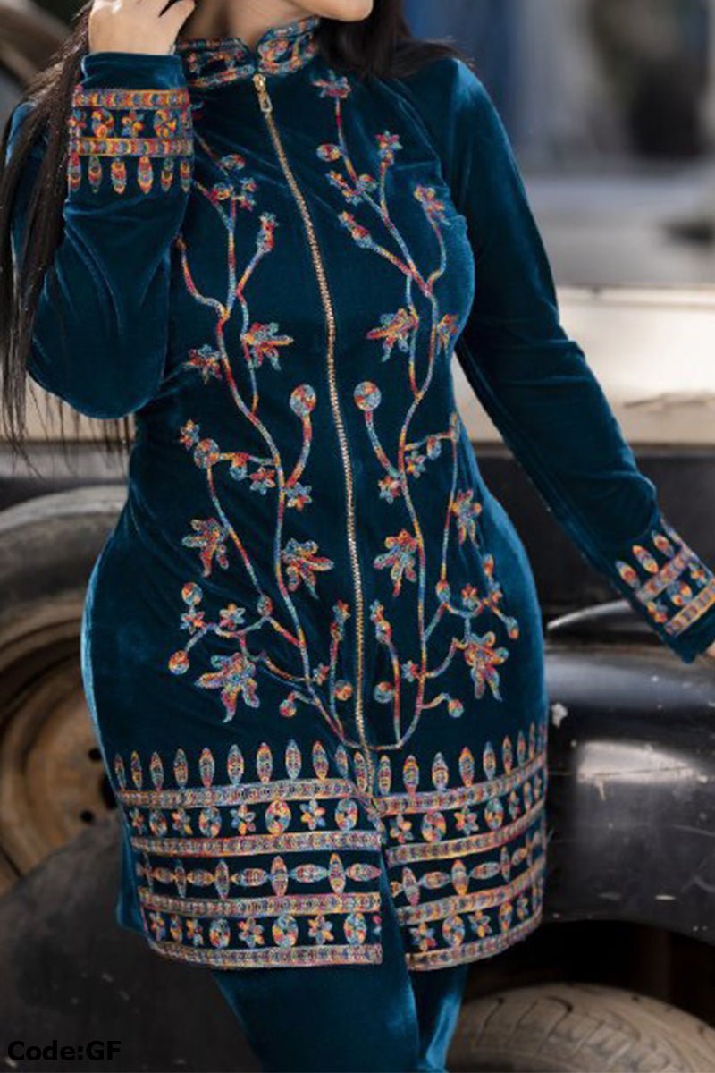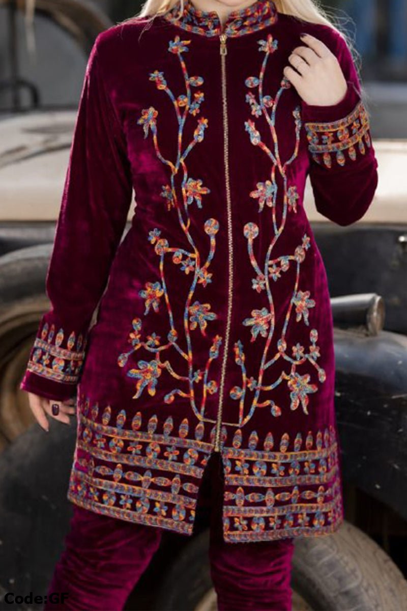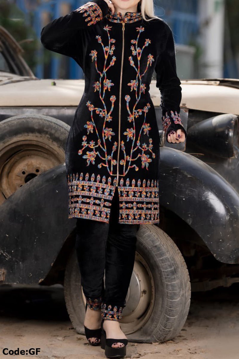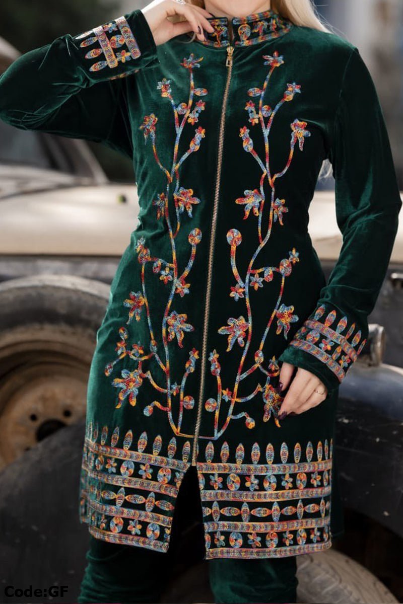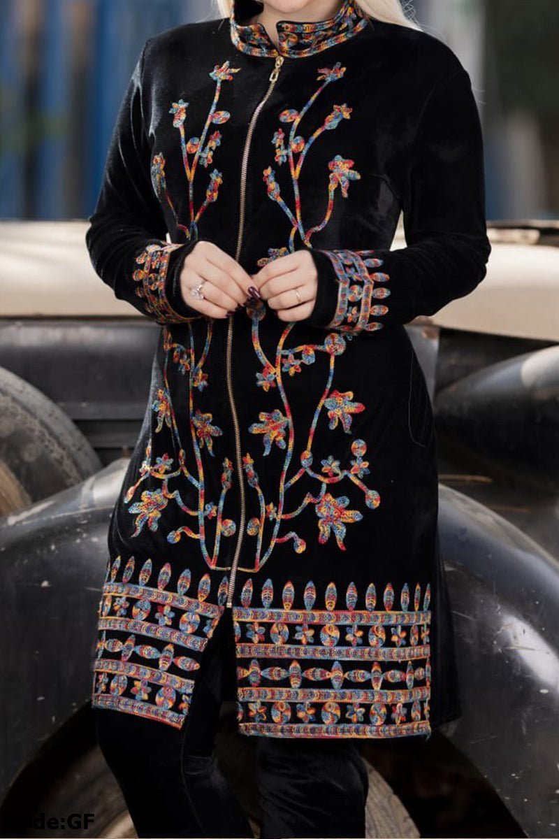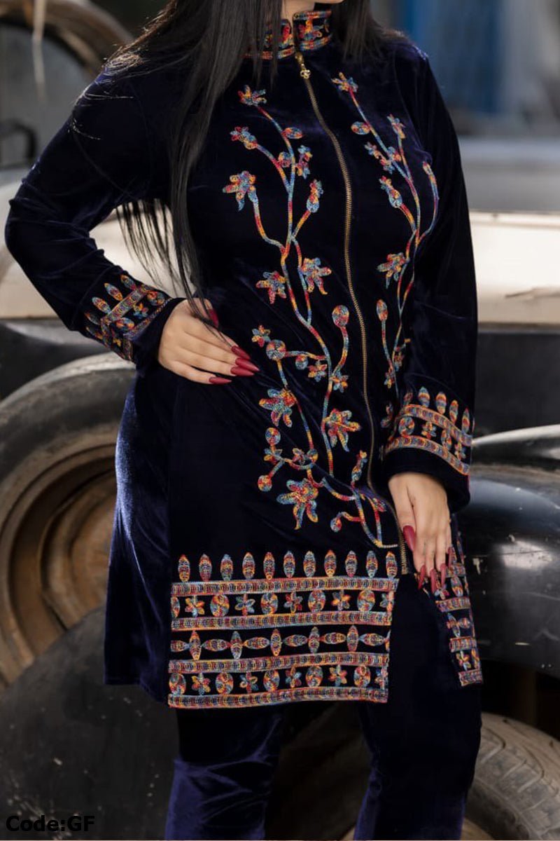 - الطقم مكون من تونيك طويل من القطيفة وبنطلون قطيفة