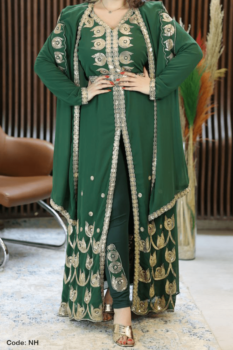 - الطقم مكون من تونيك طويل من الحرير وبنطلون وكاب شيفون