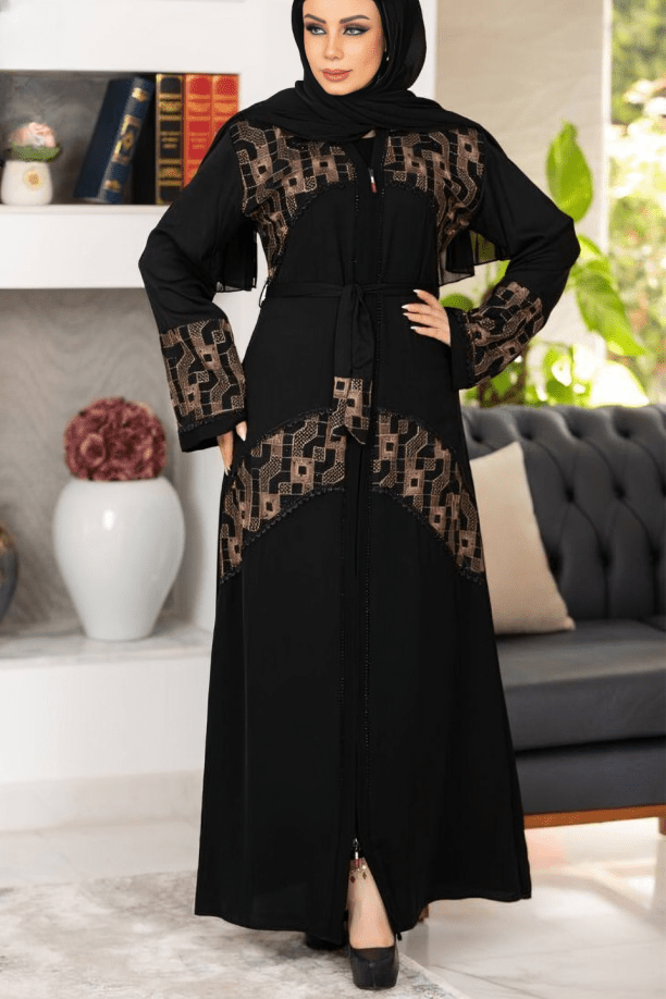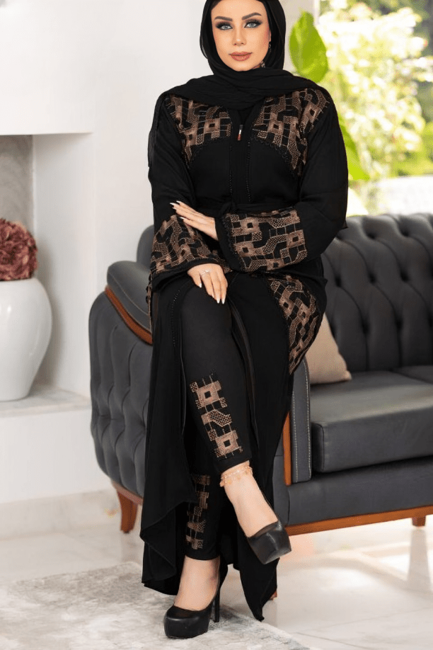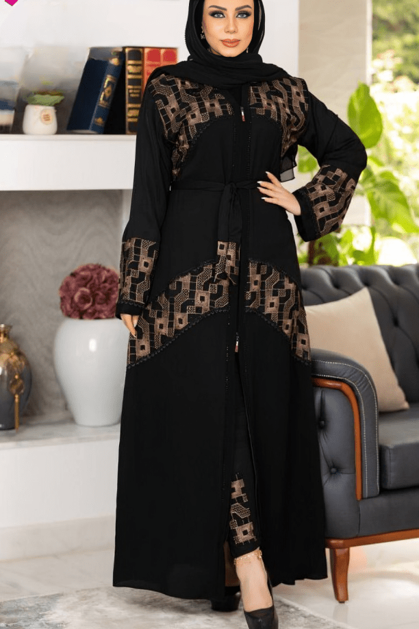 - العباية بها حزام مطرز وبها سوستة بطول العباية