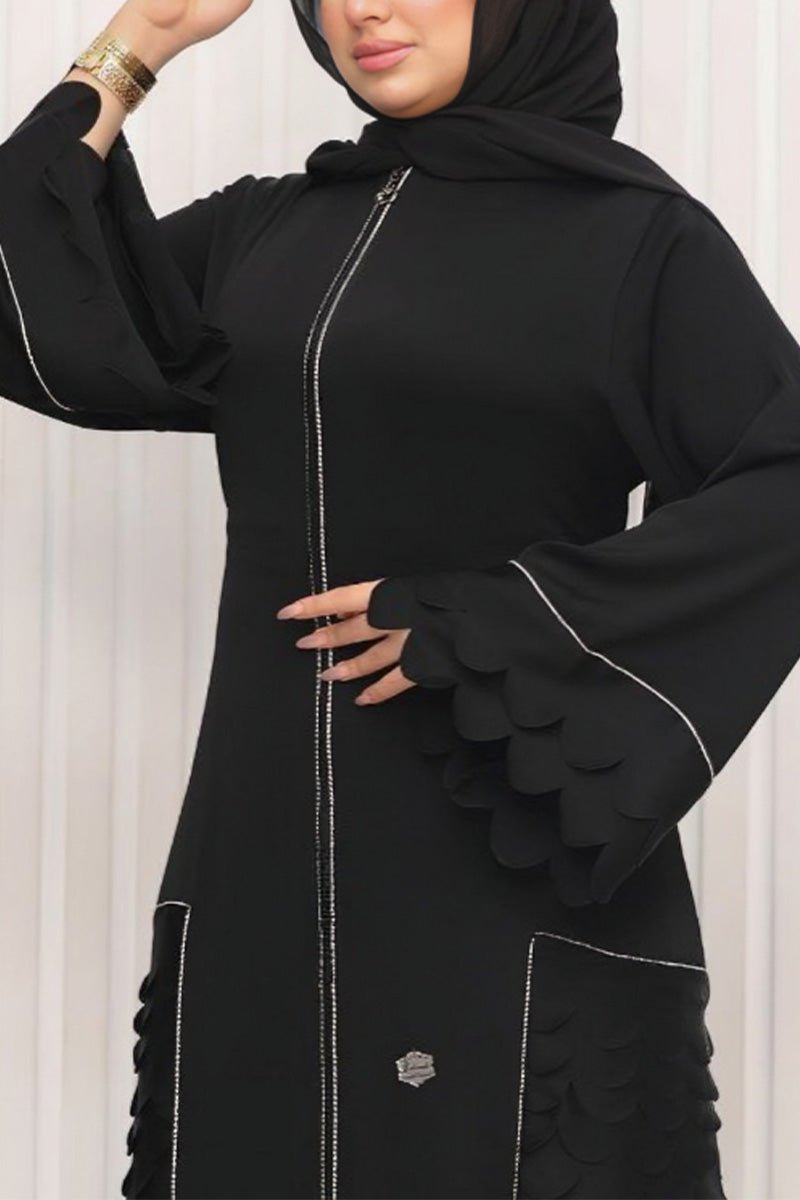 - عباية بسوستة امامية بطول العباية واكمام واسعه فس نهايتها طبقة قماش تشبه قشر السمك