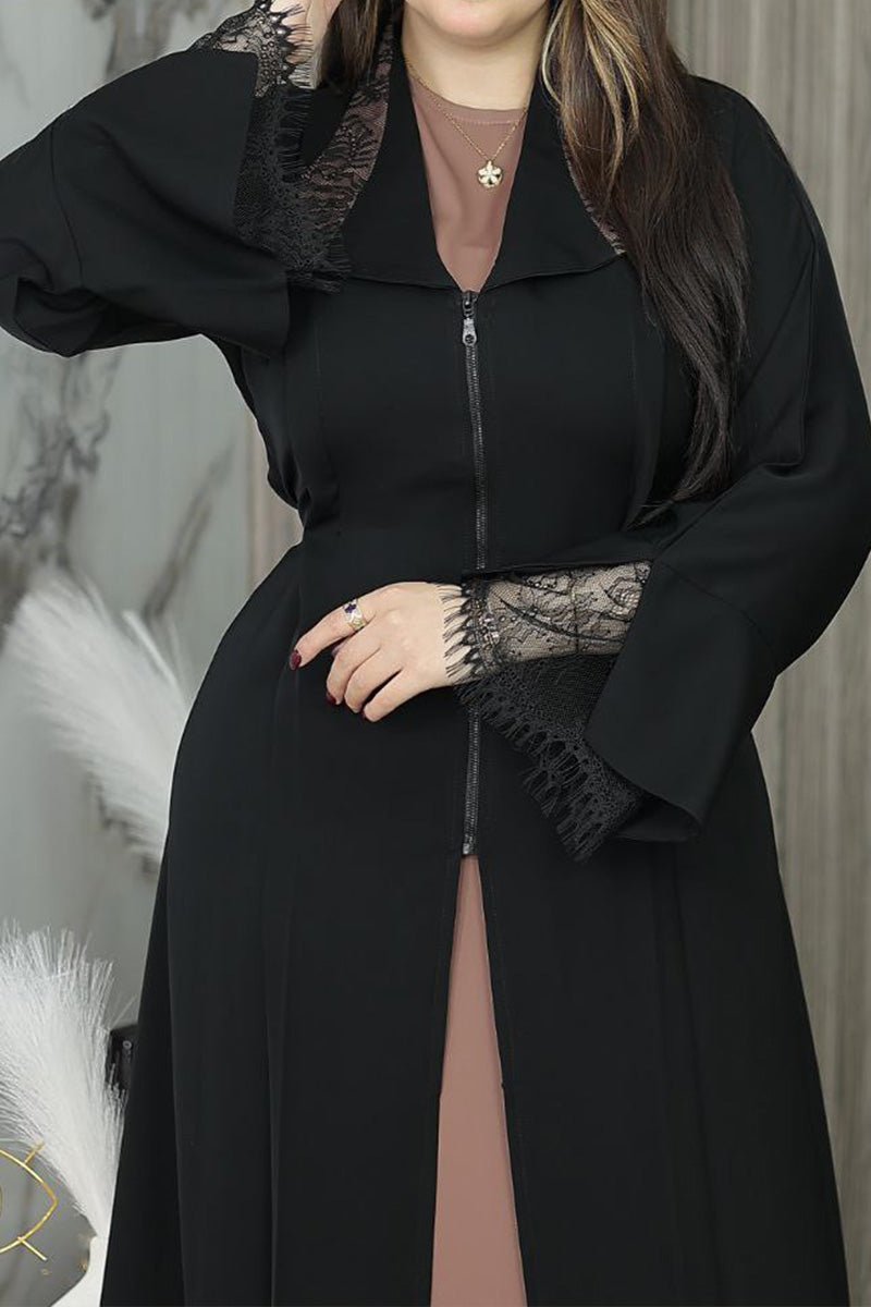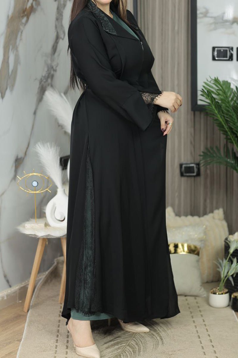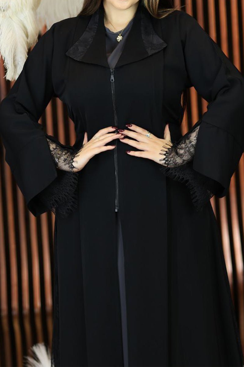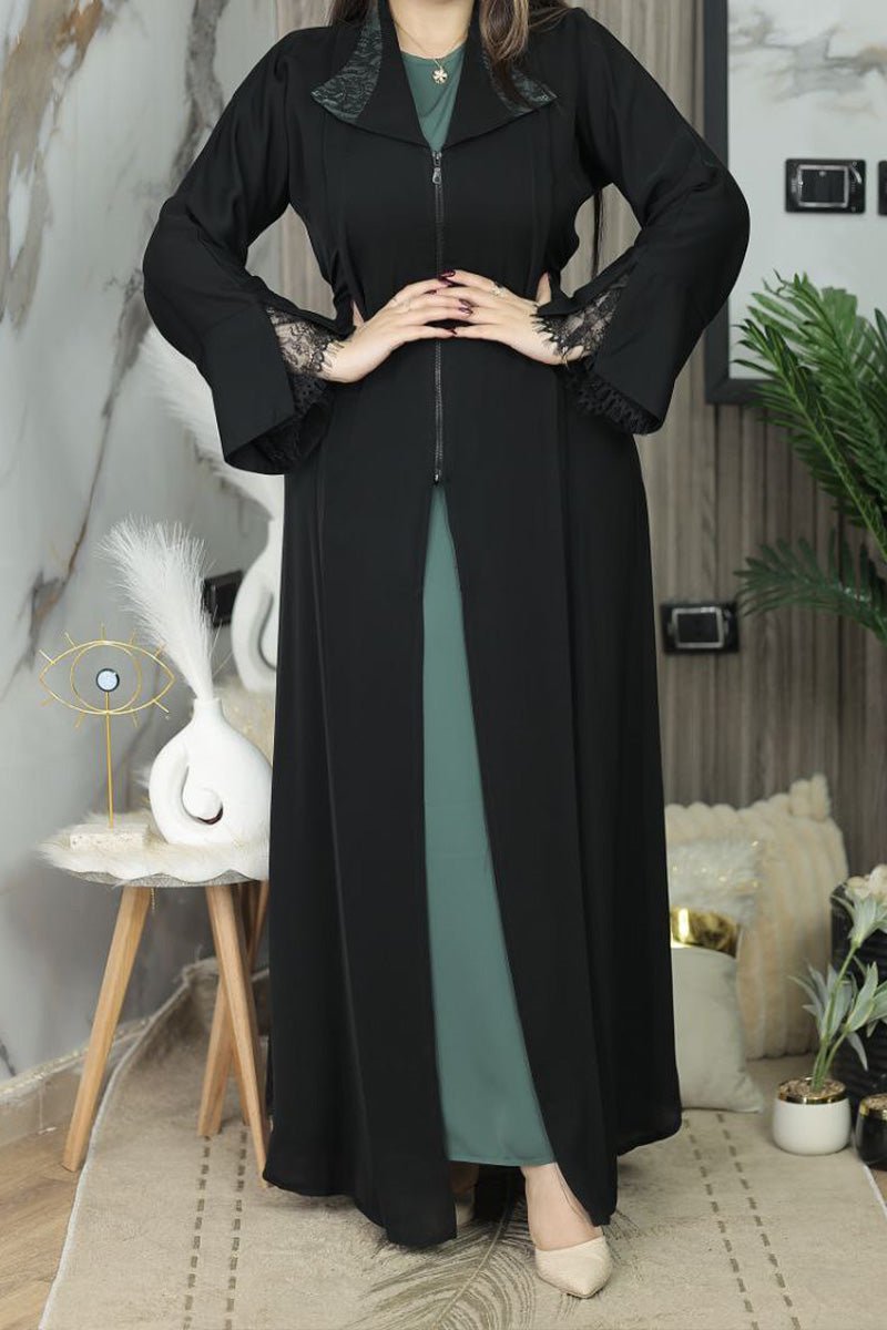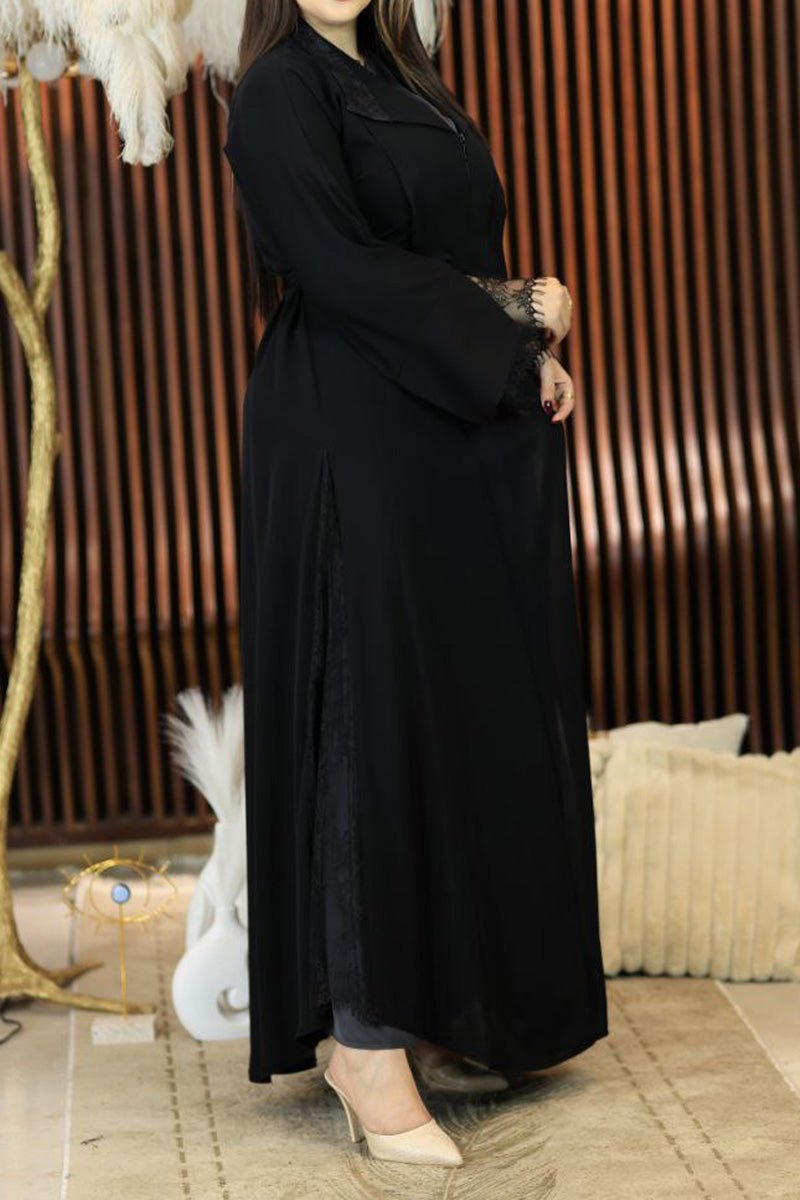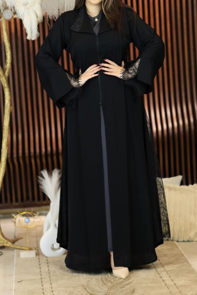 - العباية مطعمة بدانتيل علي الاكمام والياقه وعلي جانبي العباية