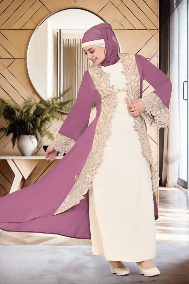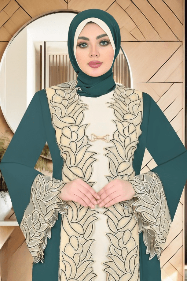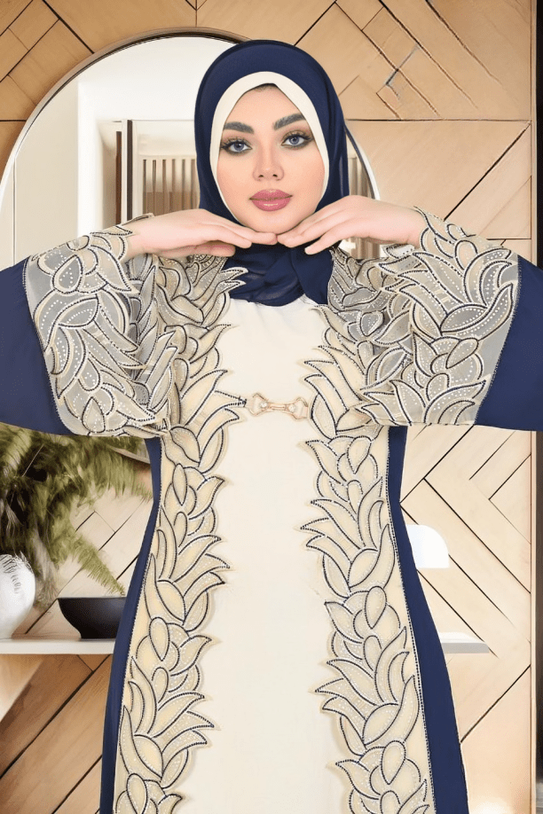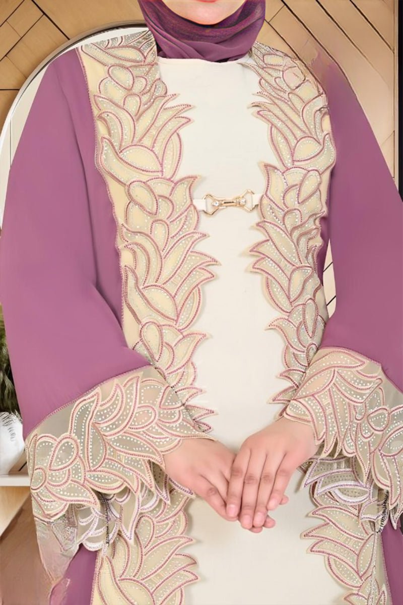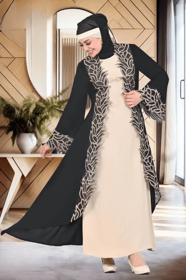 - العباية الخارجيه مطعمة بزخارف وتطريزات بارزة