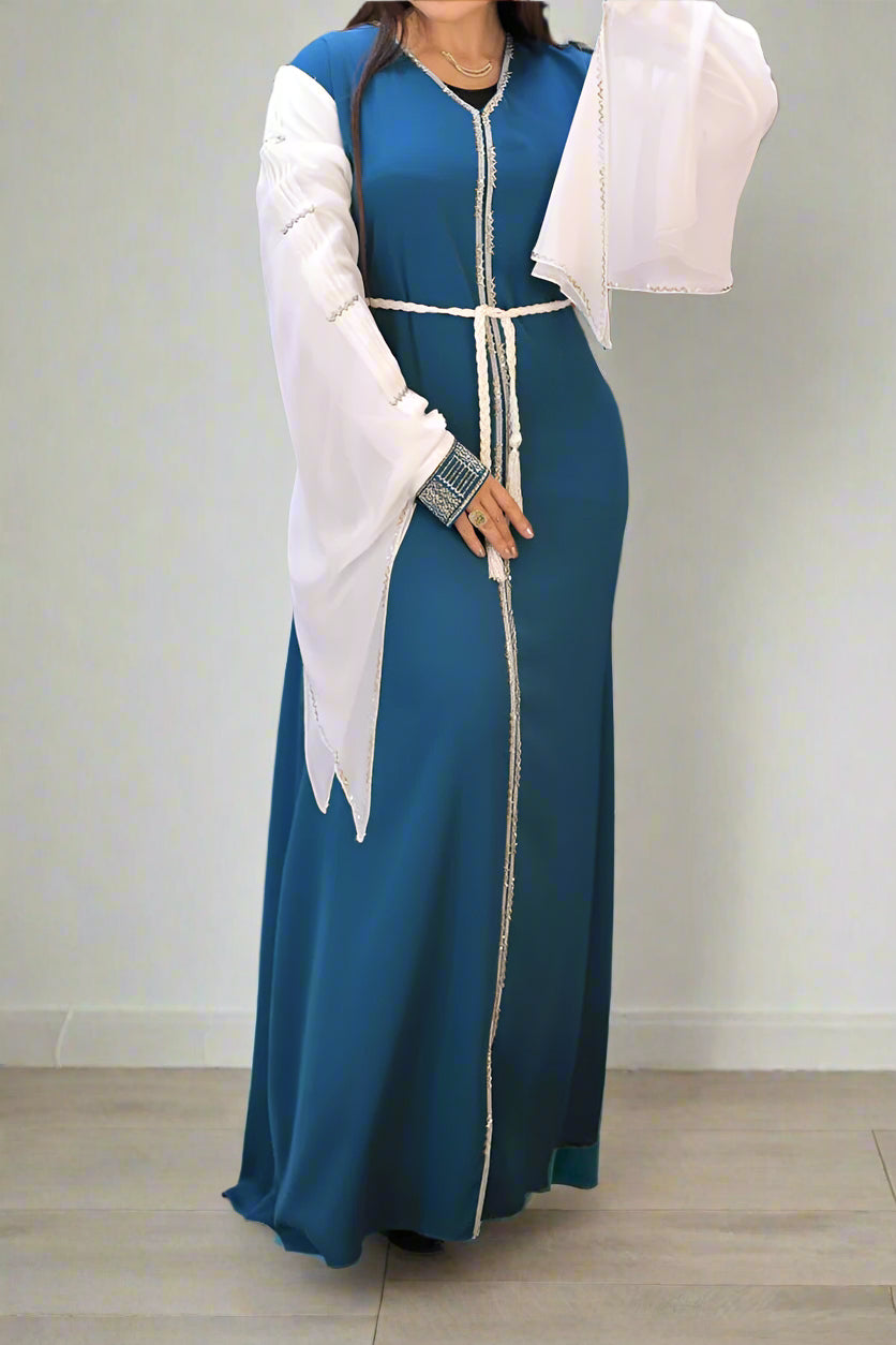 - الاكمام واسعه وطويلة في نهايتها اساور مطعمة بالاستراس