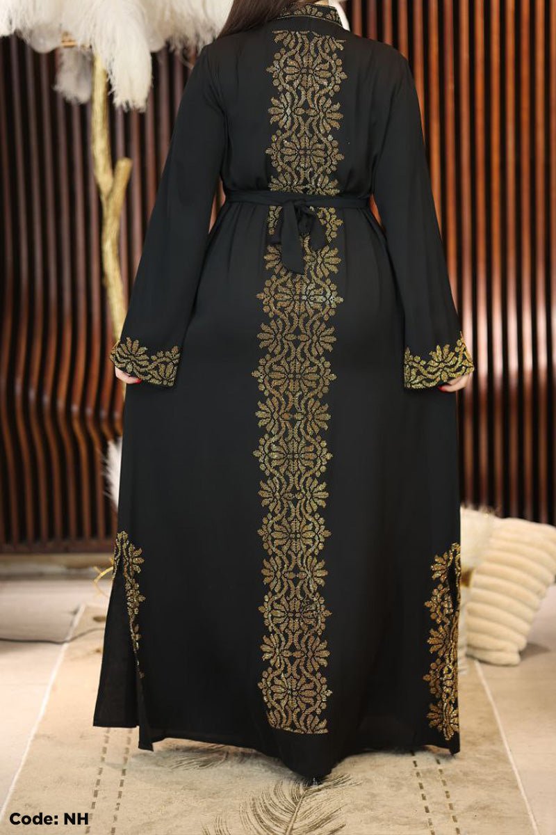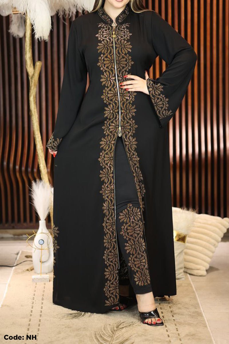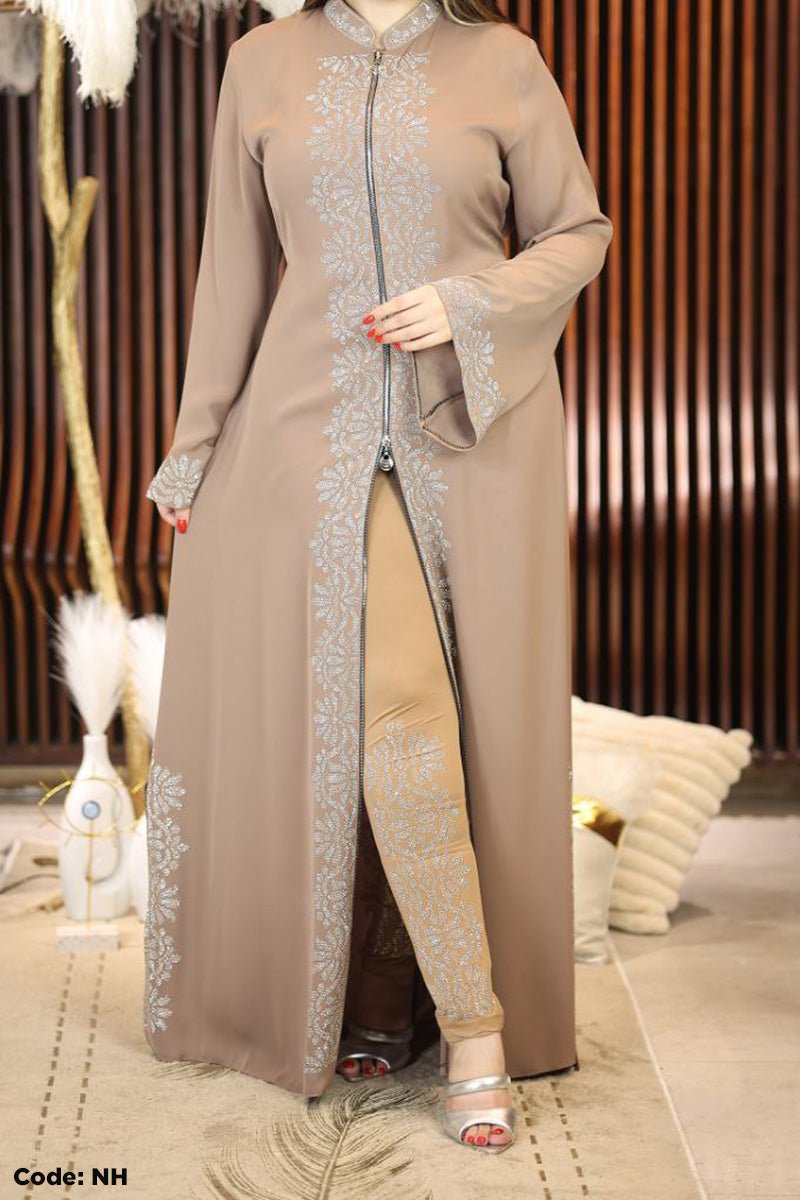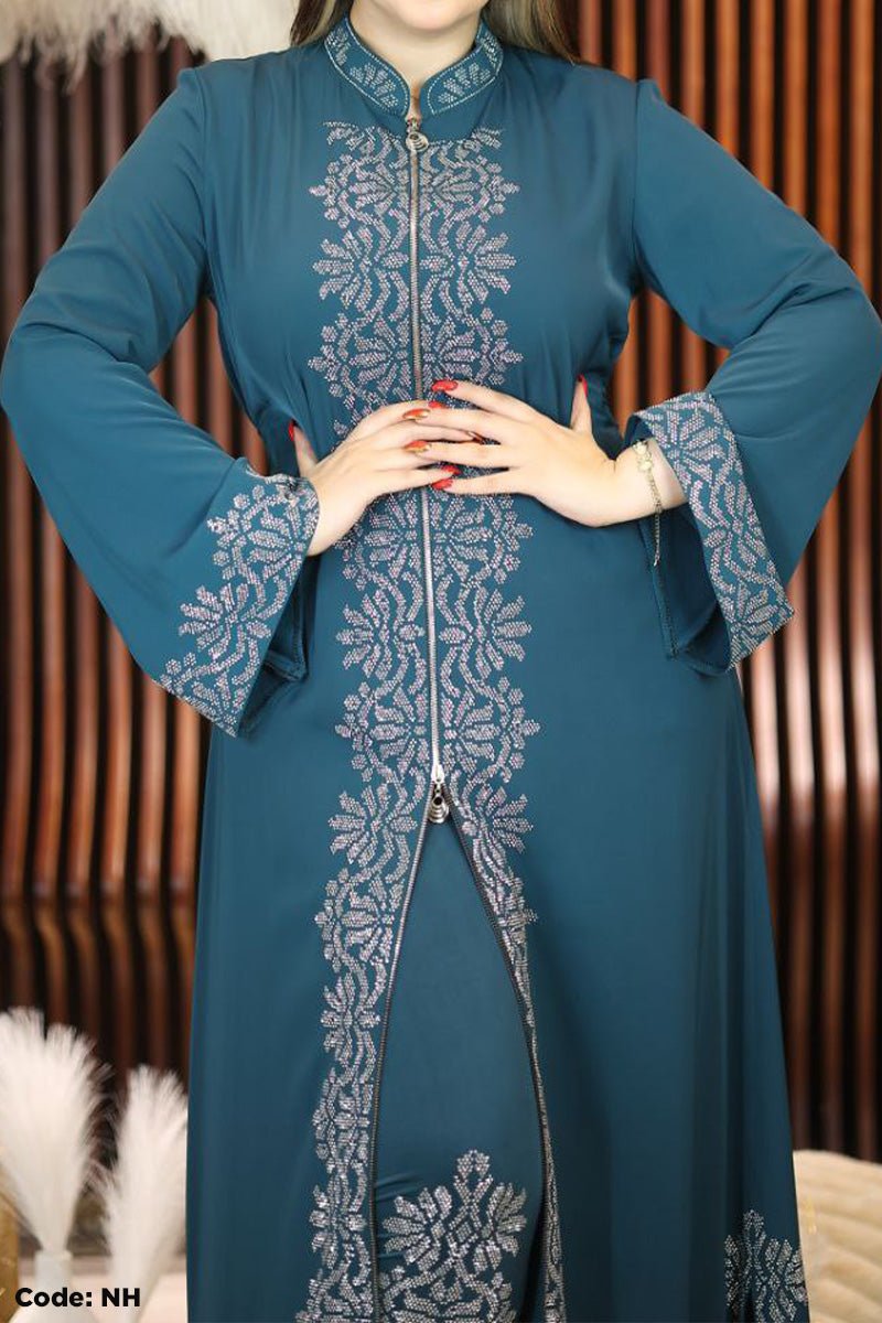 - عباية مفتوحة من الامام بسوستة وتحتها بنطلون من نفس اللون والتطريز