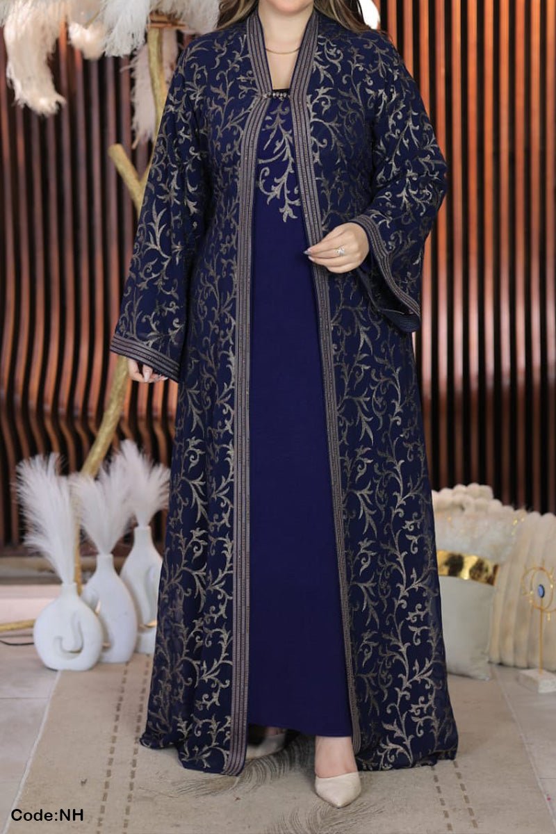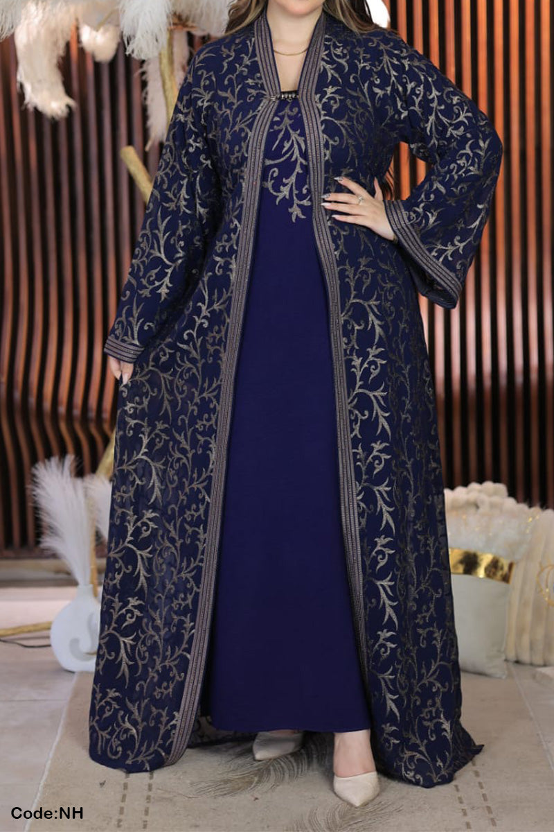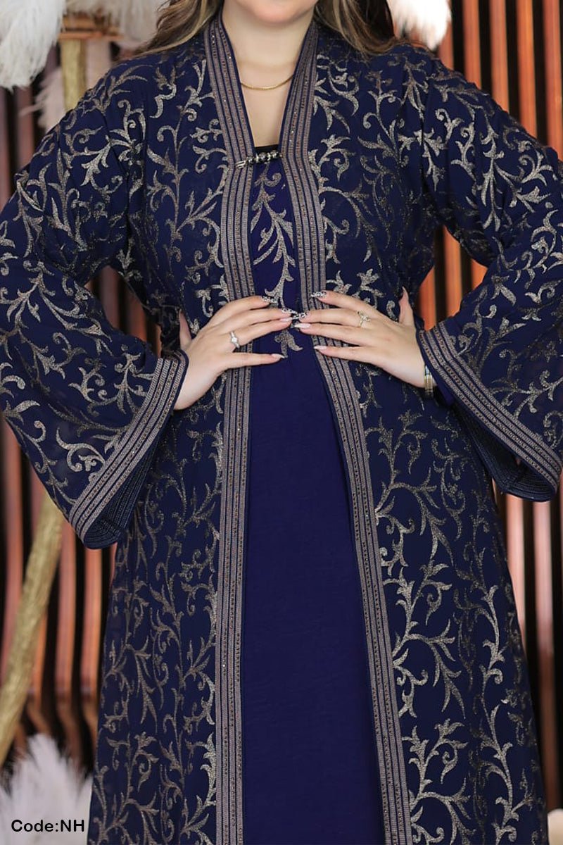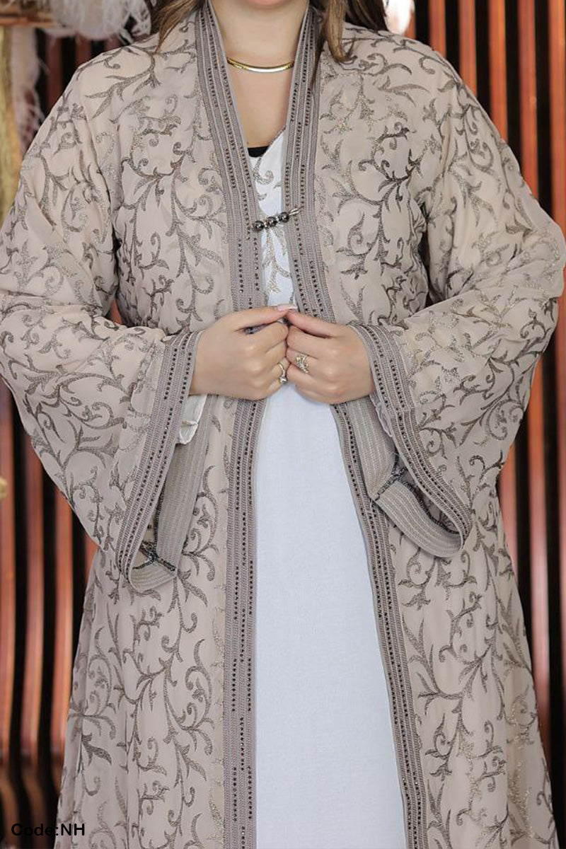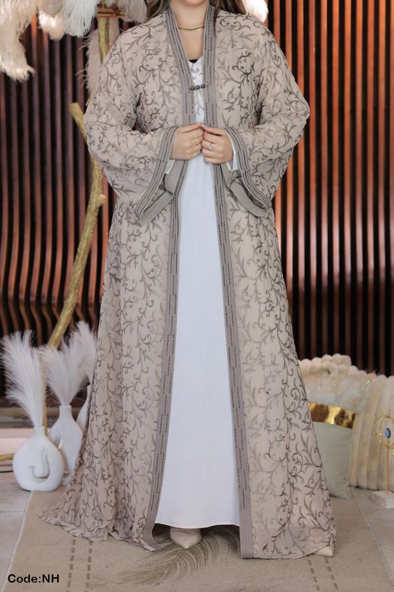 - عباية من قطعتين : عباية مفتوحة من الشيفون المطرز وتحتها عباية من الحرير