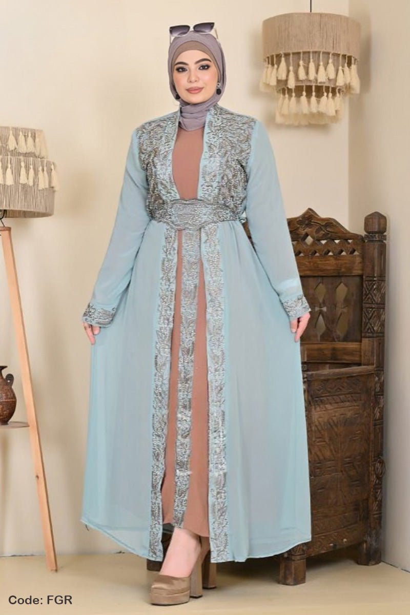 - التطريز: التطريز بخيوط لامعة علي الصدر والاكمام وبطول العباية