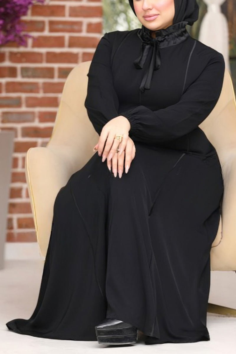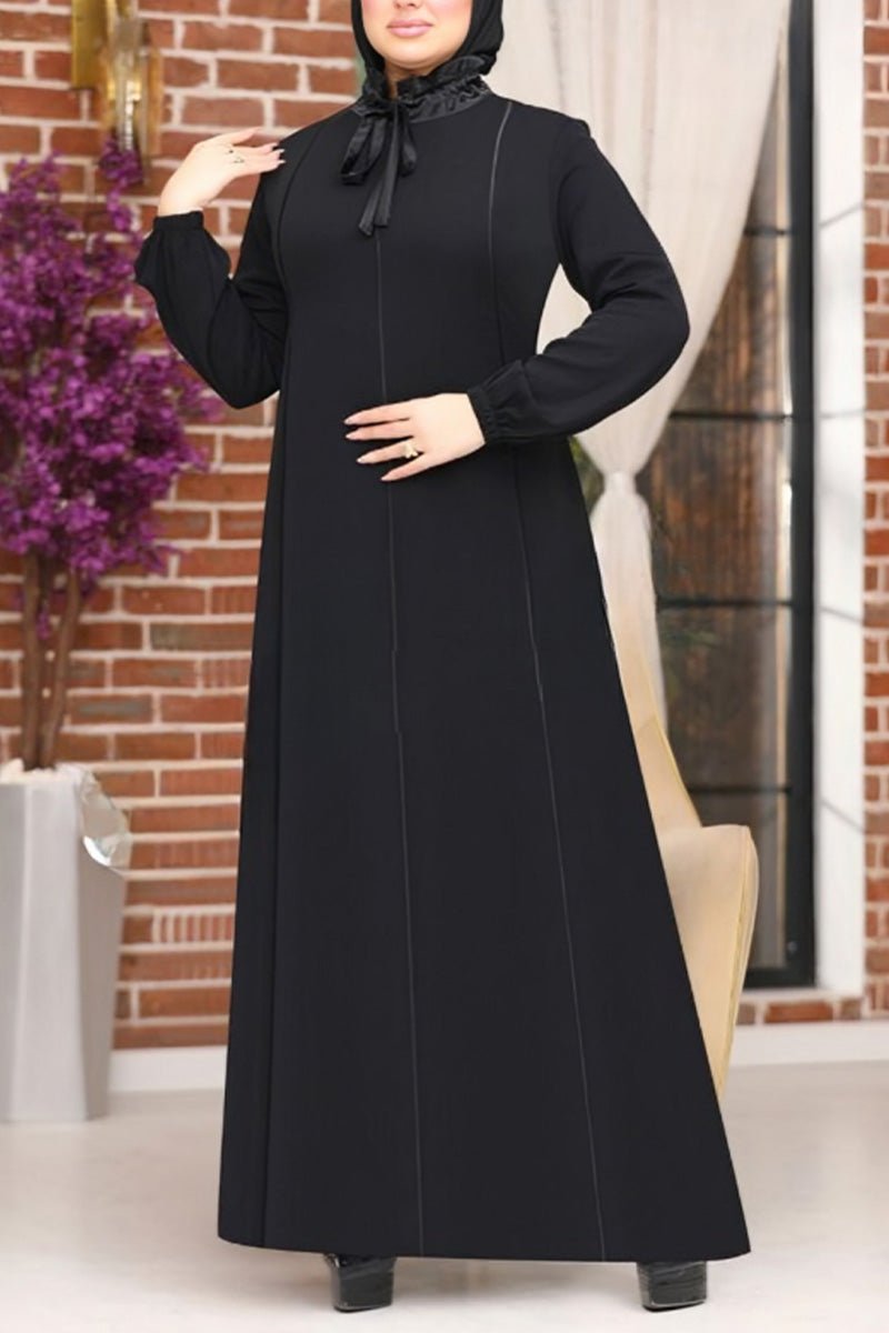 - عباية بكم في نهايته استيك وعلي الرقبة مطعمة برابطة عنق