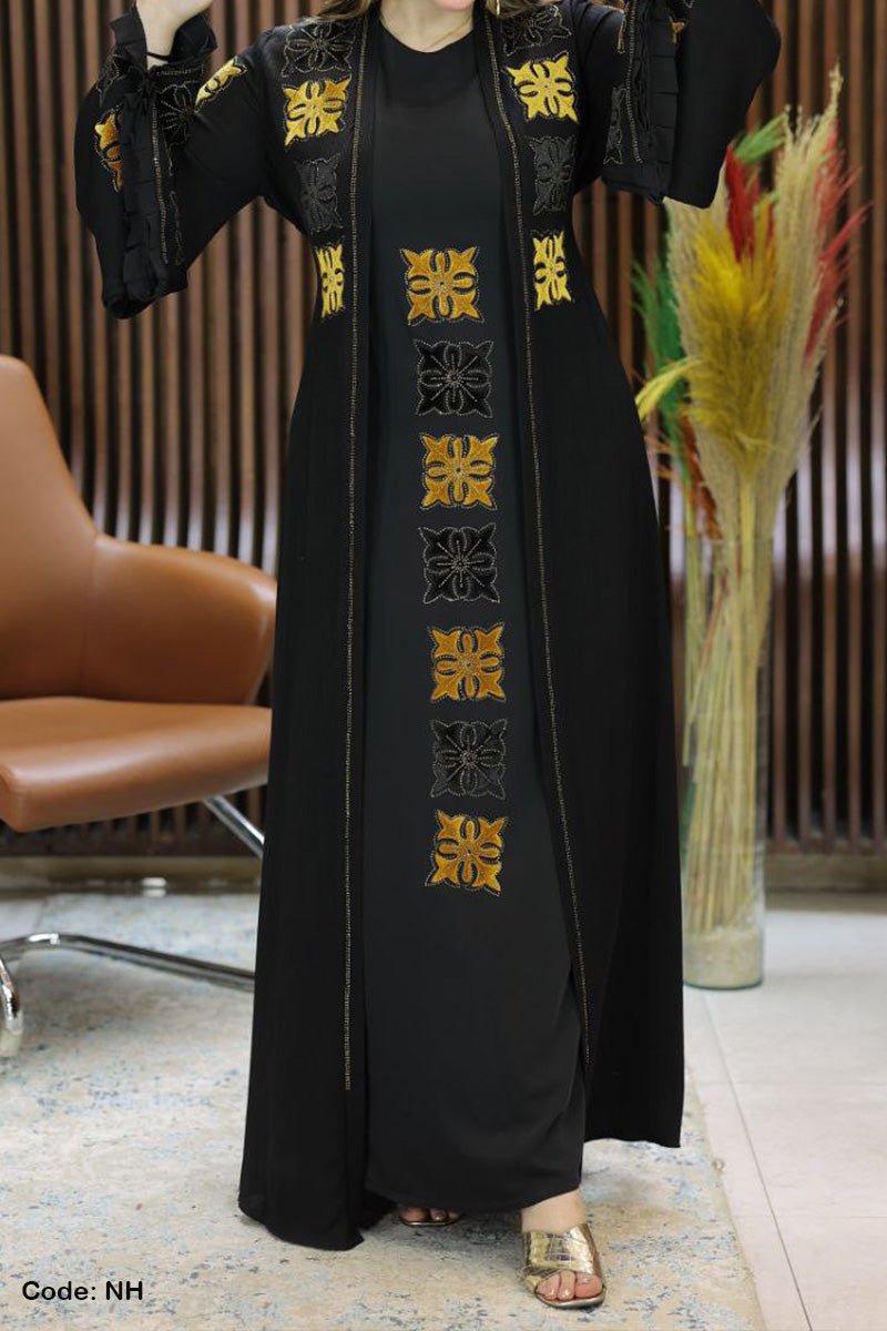 • العباية عبارة عن قطعتين : عباية مفتوحة بكم وتحتها تلبيسة