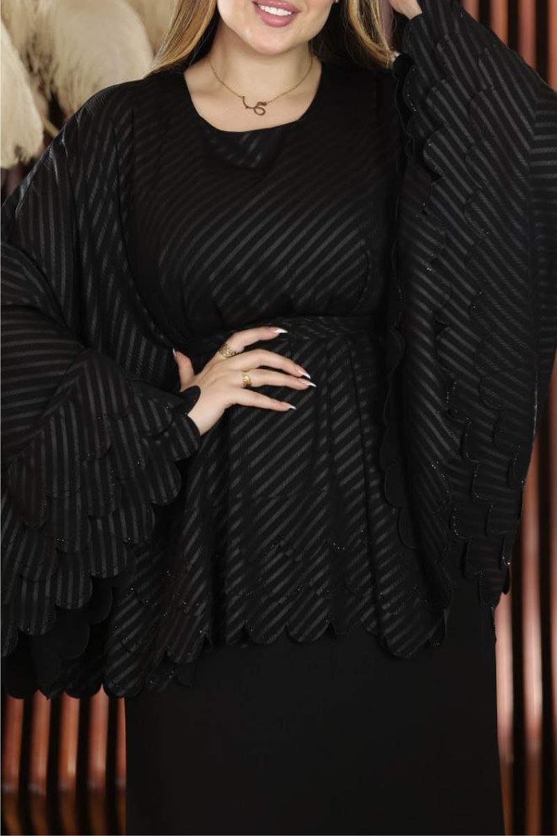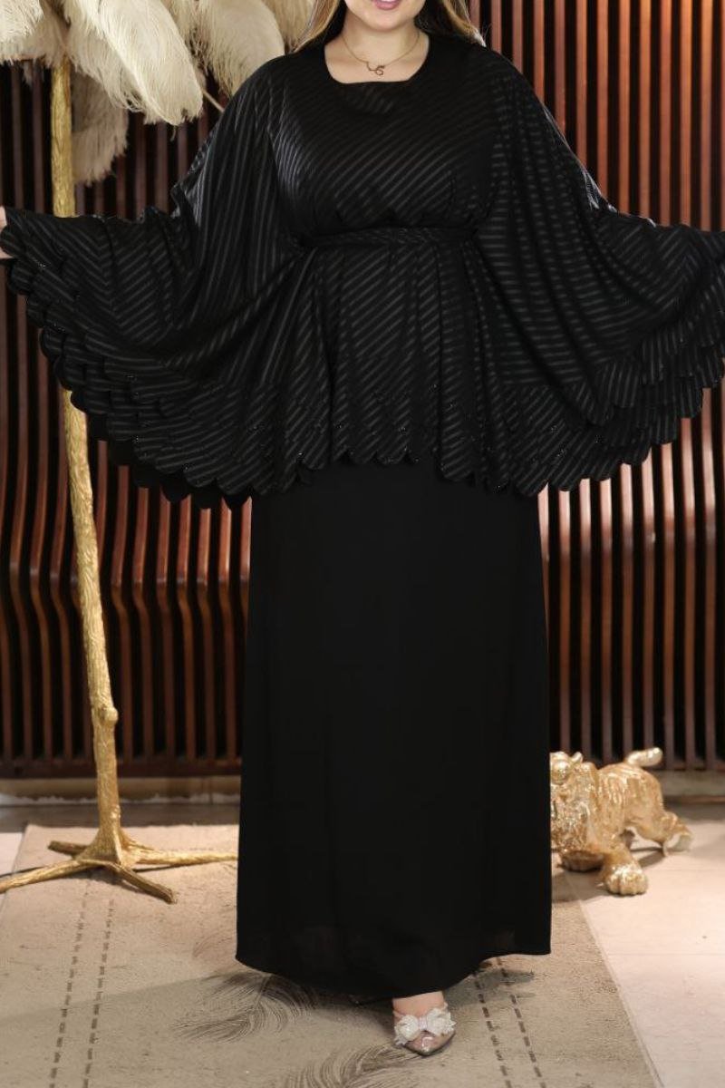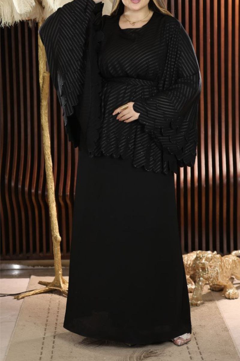 - عباية سوداء باكمام واسعه تبدوا انها قطعتين ولكنها قطعه واحده