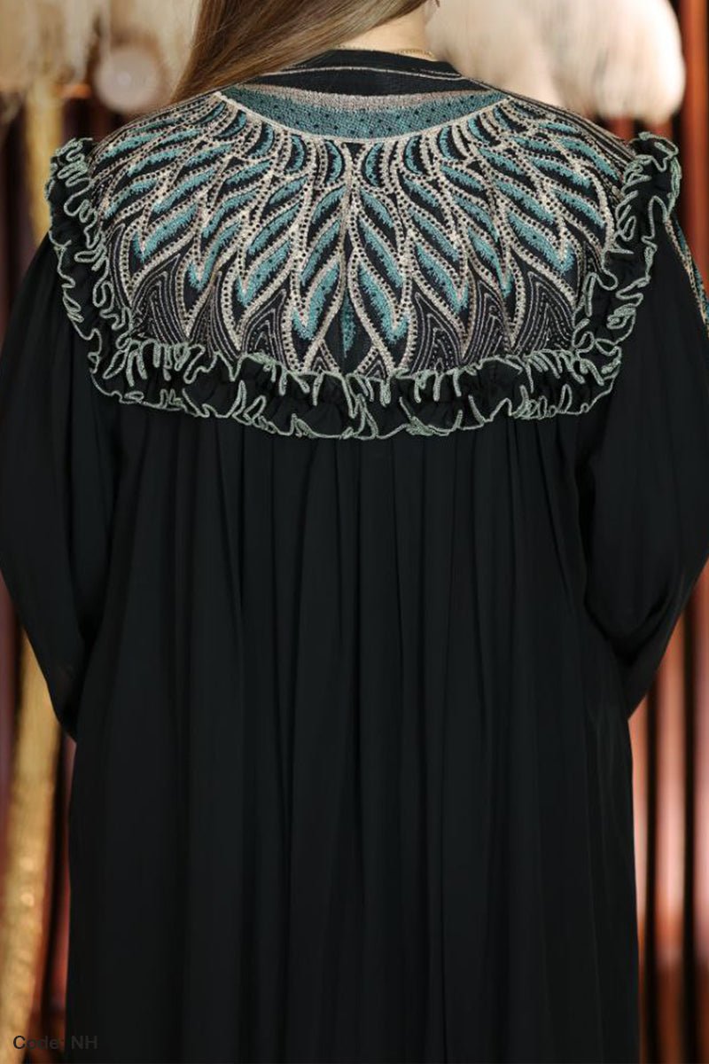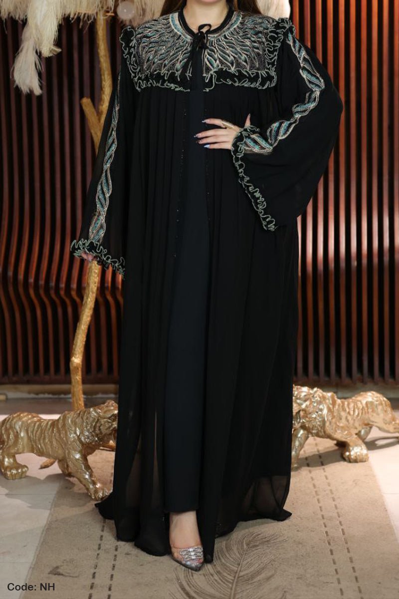 - التطريز : تطريز باستراس لامع وخيوط حرير ملونة