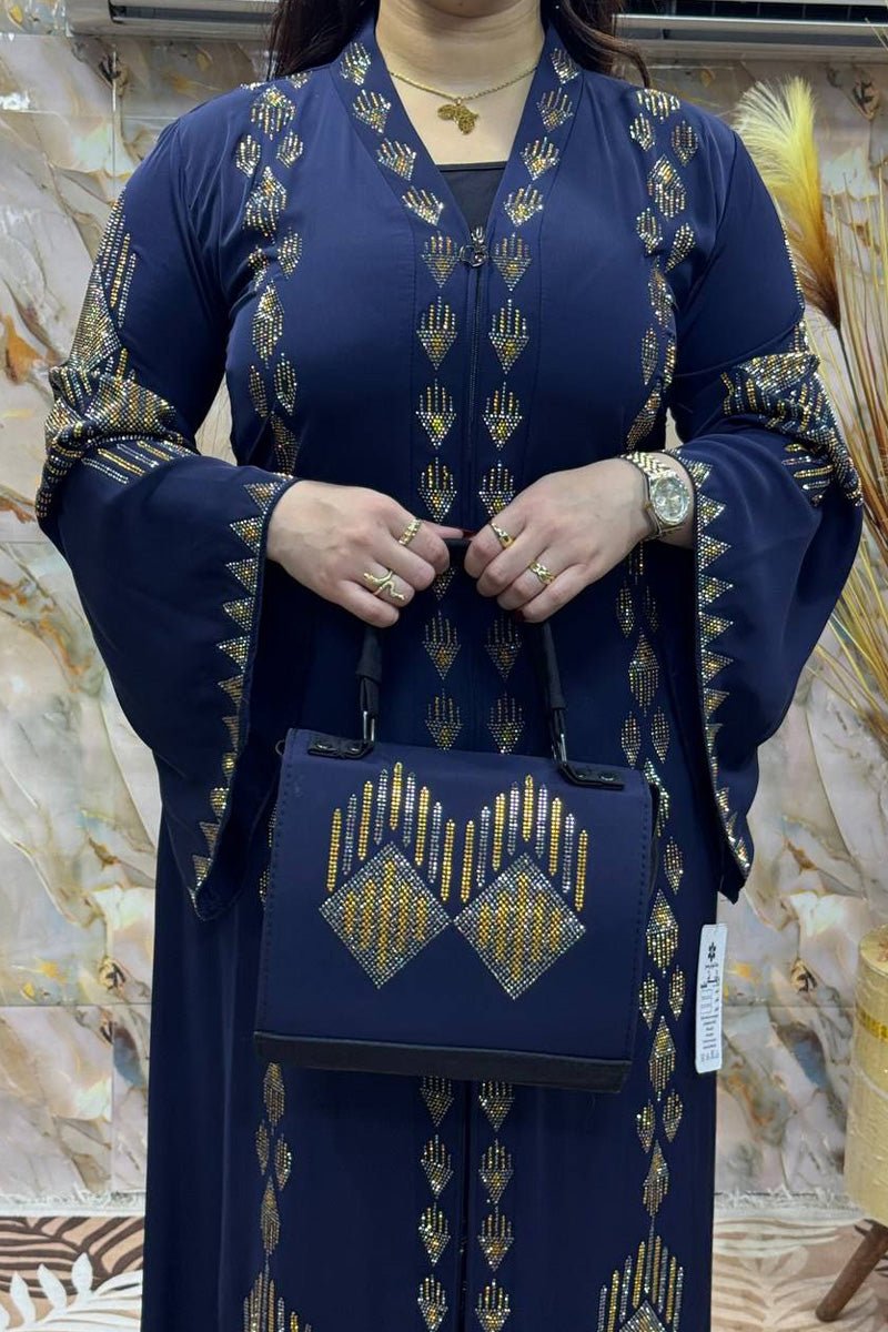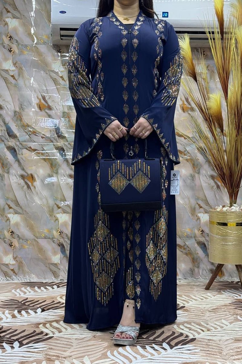 - التطريز: علي الصدر والاكمام وعلي طول العباية بالكامل وعلي البنطلون من الاسفل وعلي الحقيبة