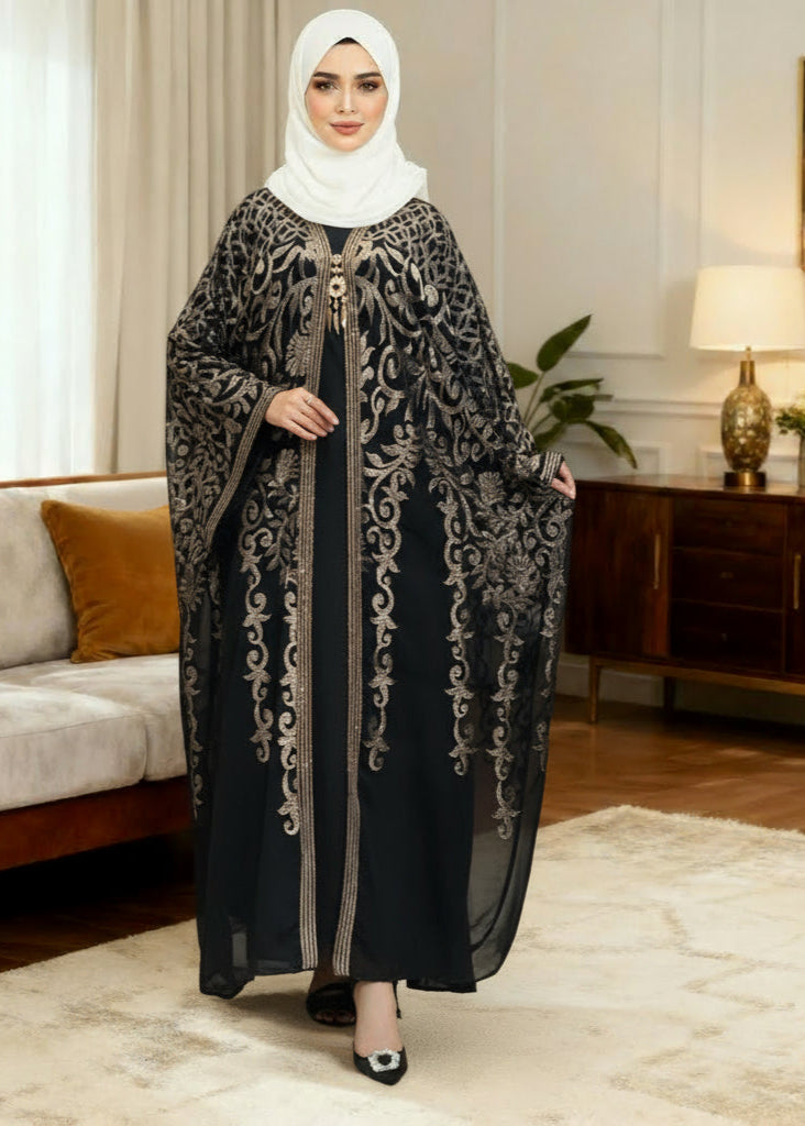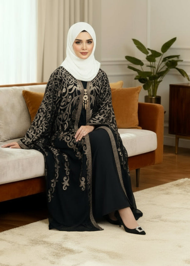 - عباية سوداء مكونة من قطعتين بيزك وعباية مفتوحة من الامام