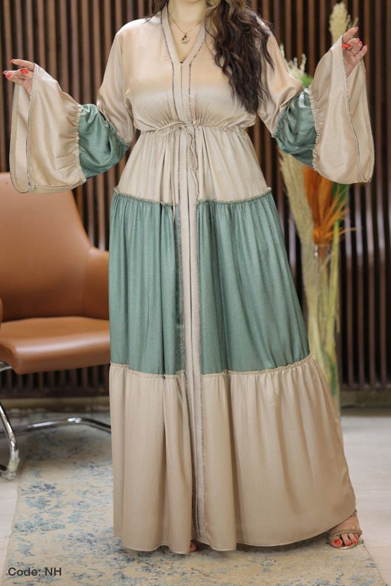 - عباية ادوار تشبه الفستان كل دور بلون بالتبادل بين الاخضر الفاتح والبيج
