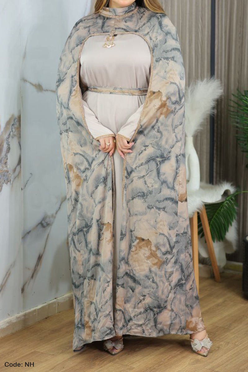 - عباية ملكية مكونة من قطعتين عباية بكم ووشاح واسع منقوش