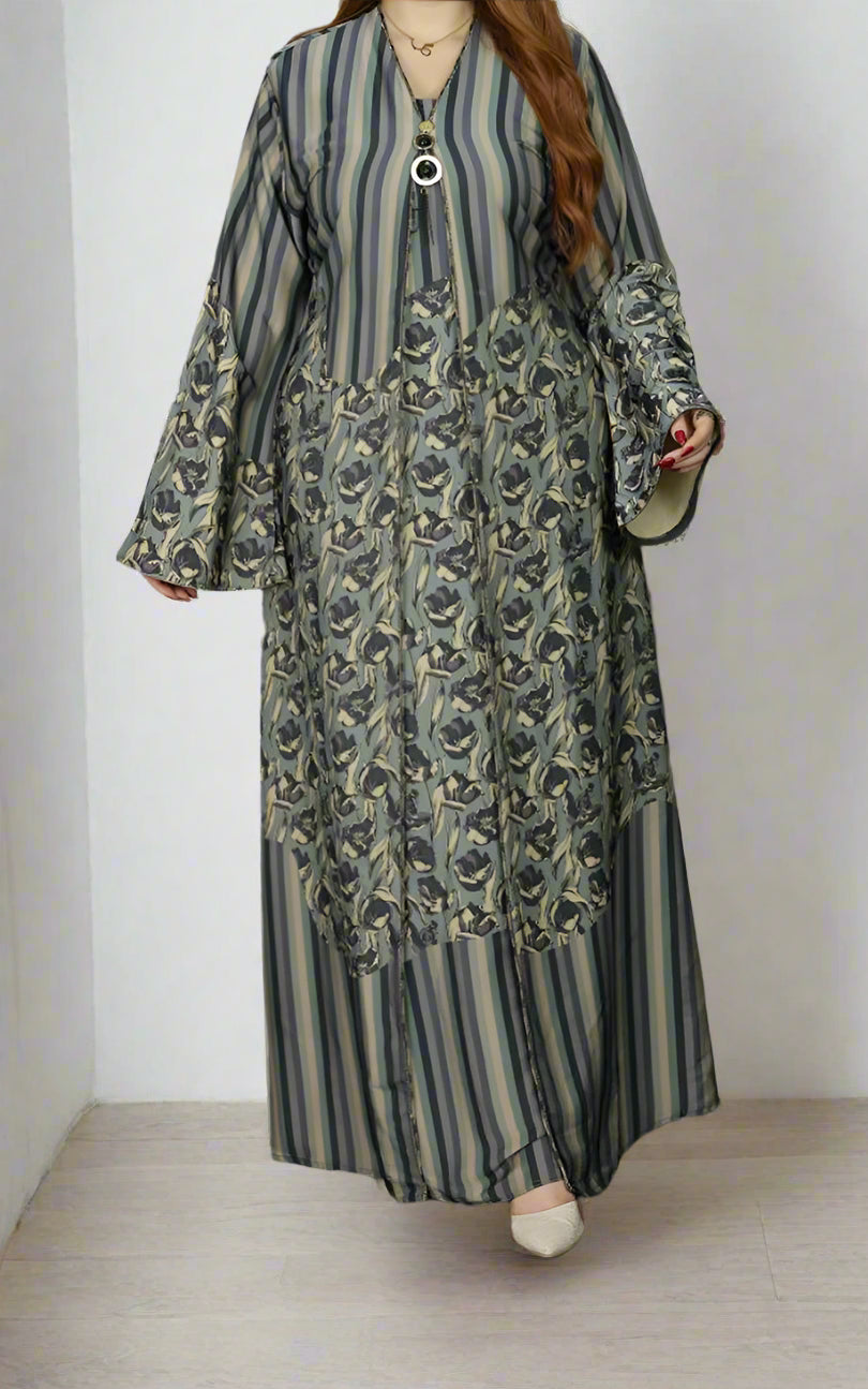 - العباية منقوشة بنقوش متداخلة باللون الاخضر والبيج