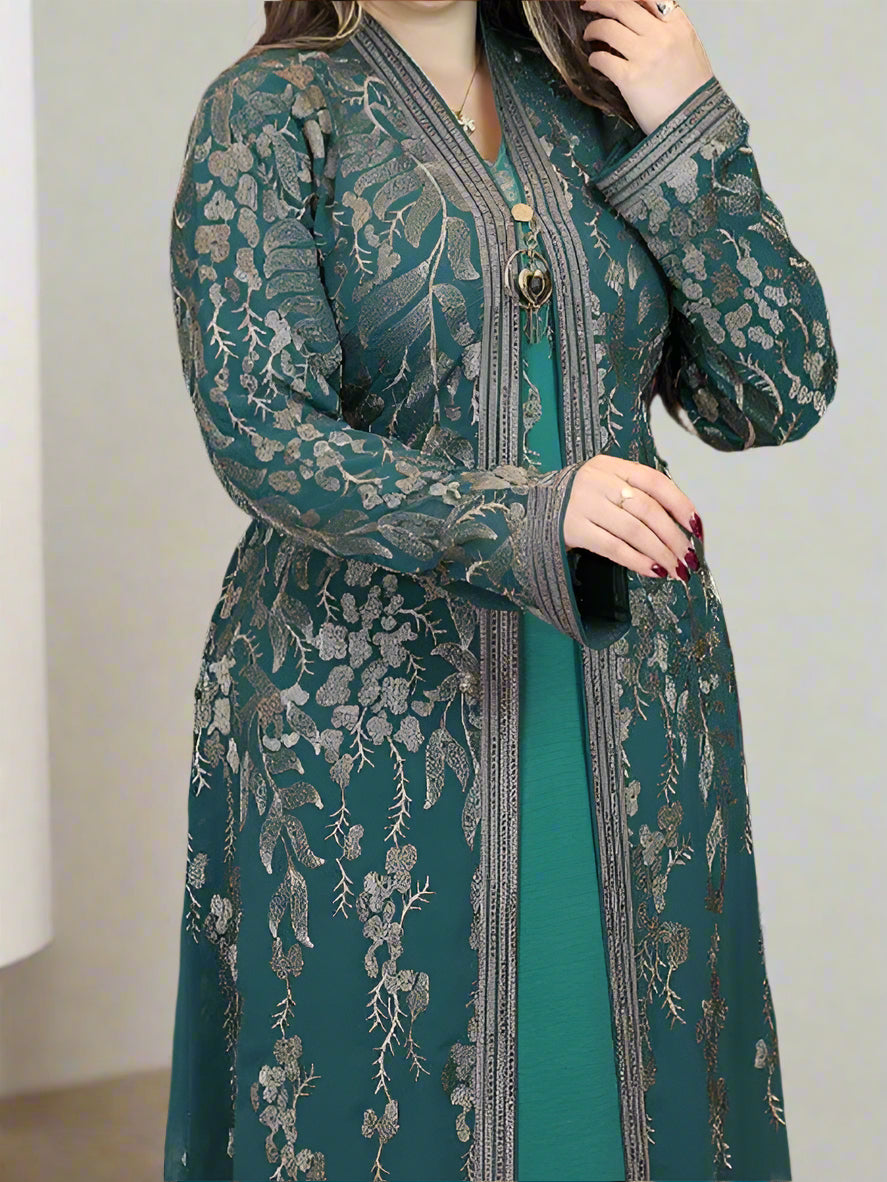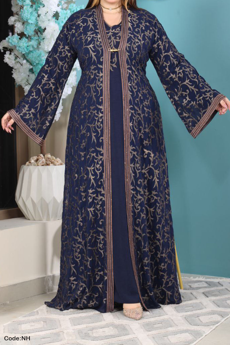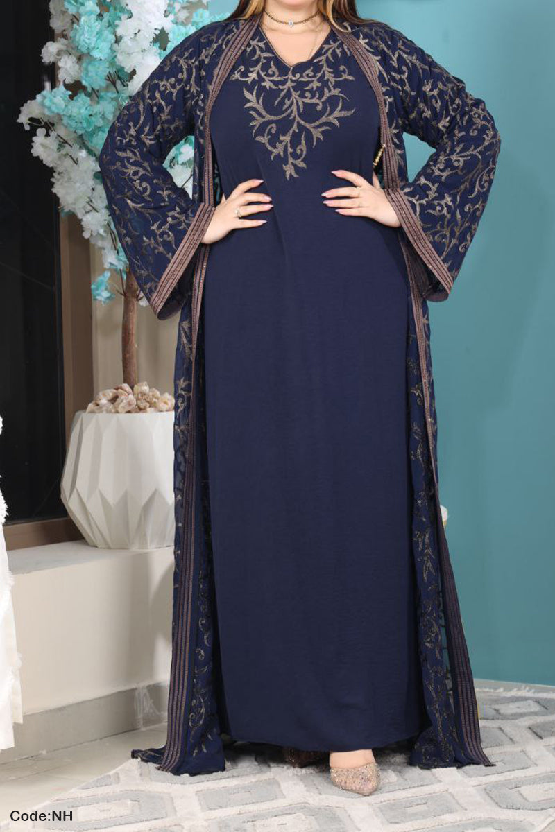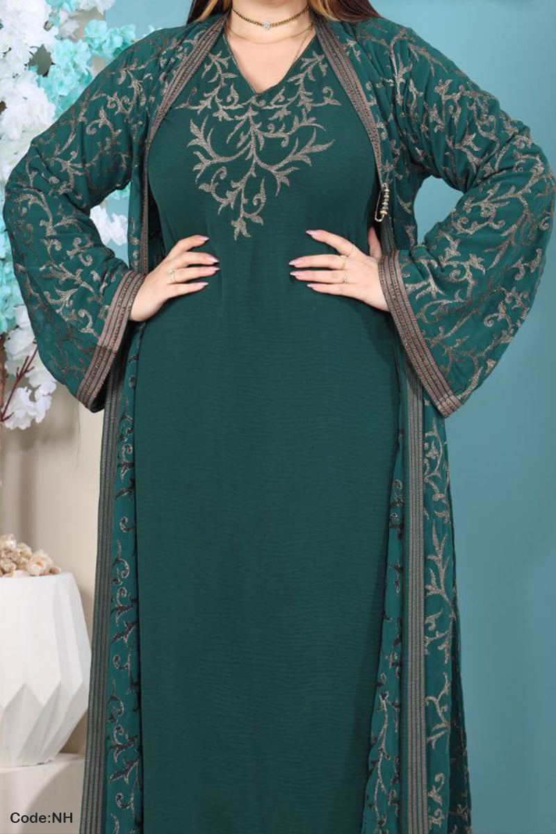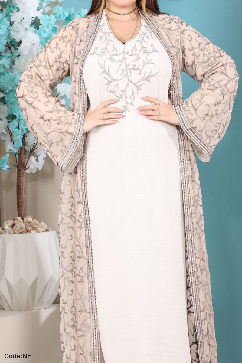 • عباية من قطعتين : عباية مفتوحة من الشيفون المطرز وتحتها عباية من الحرير