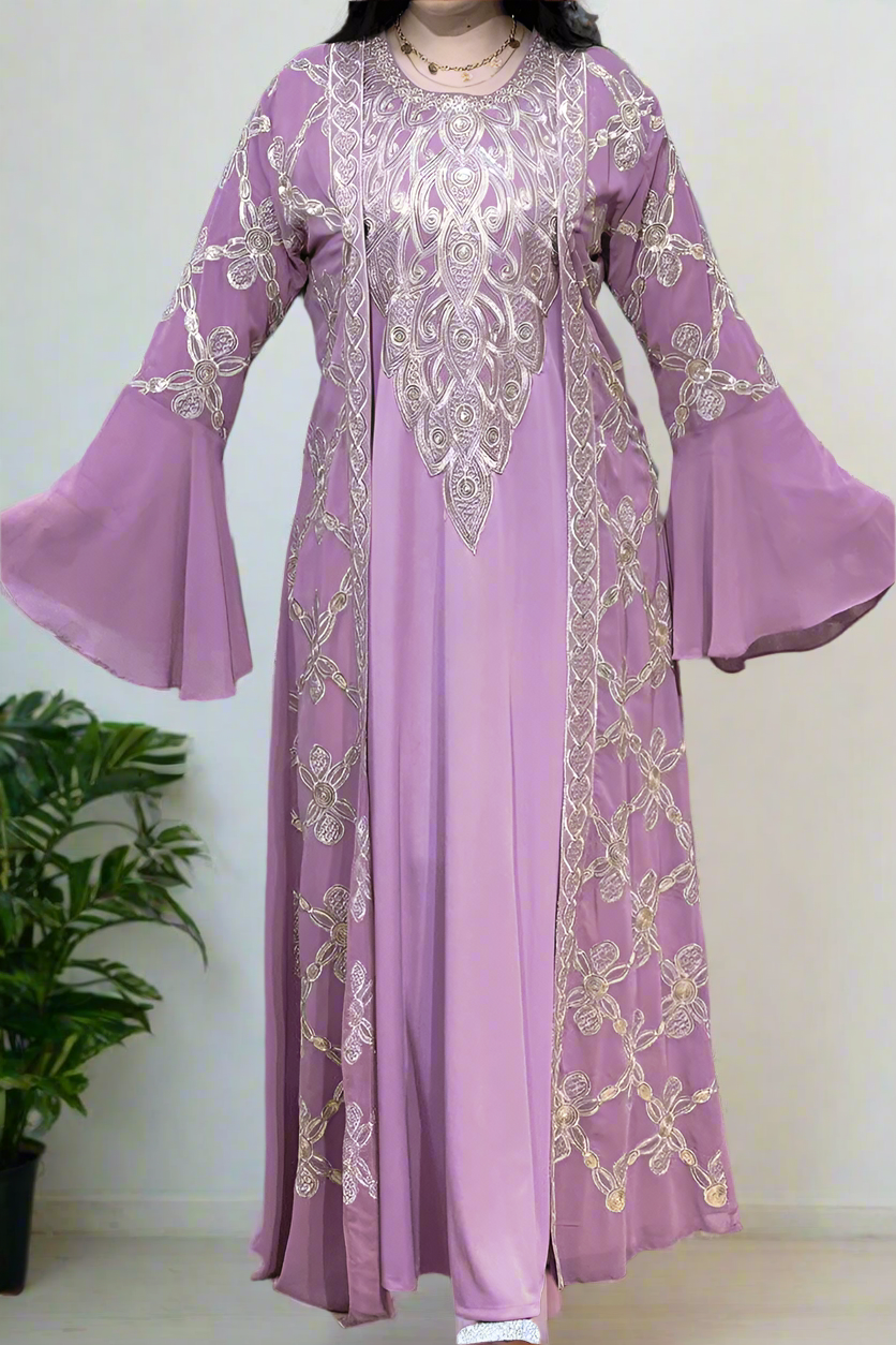 - عباية مكونة من قطعتين بيزك بكم وقفطان شيفون بكم كلوش مطرز بالكامل