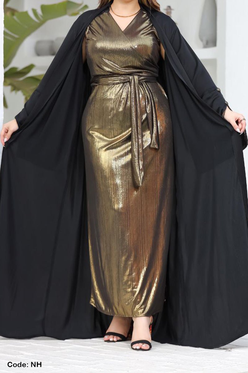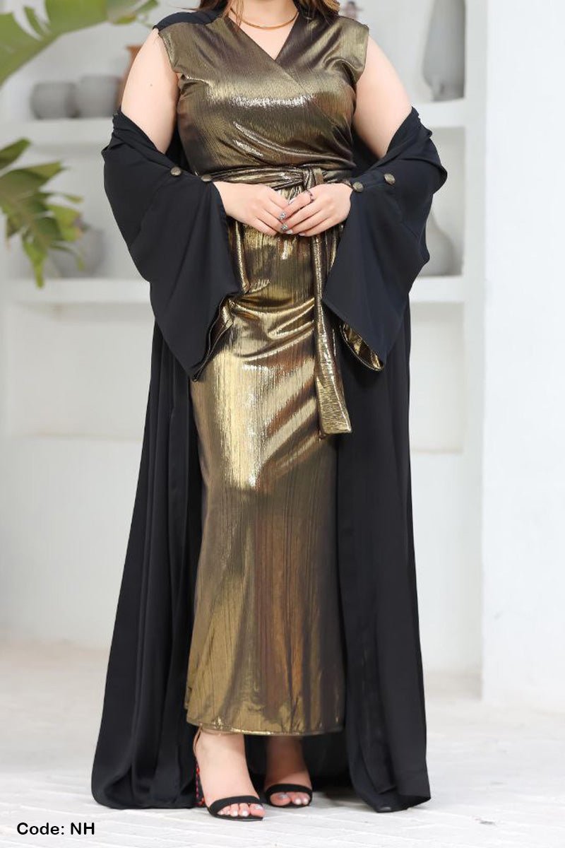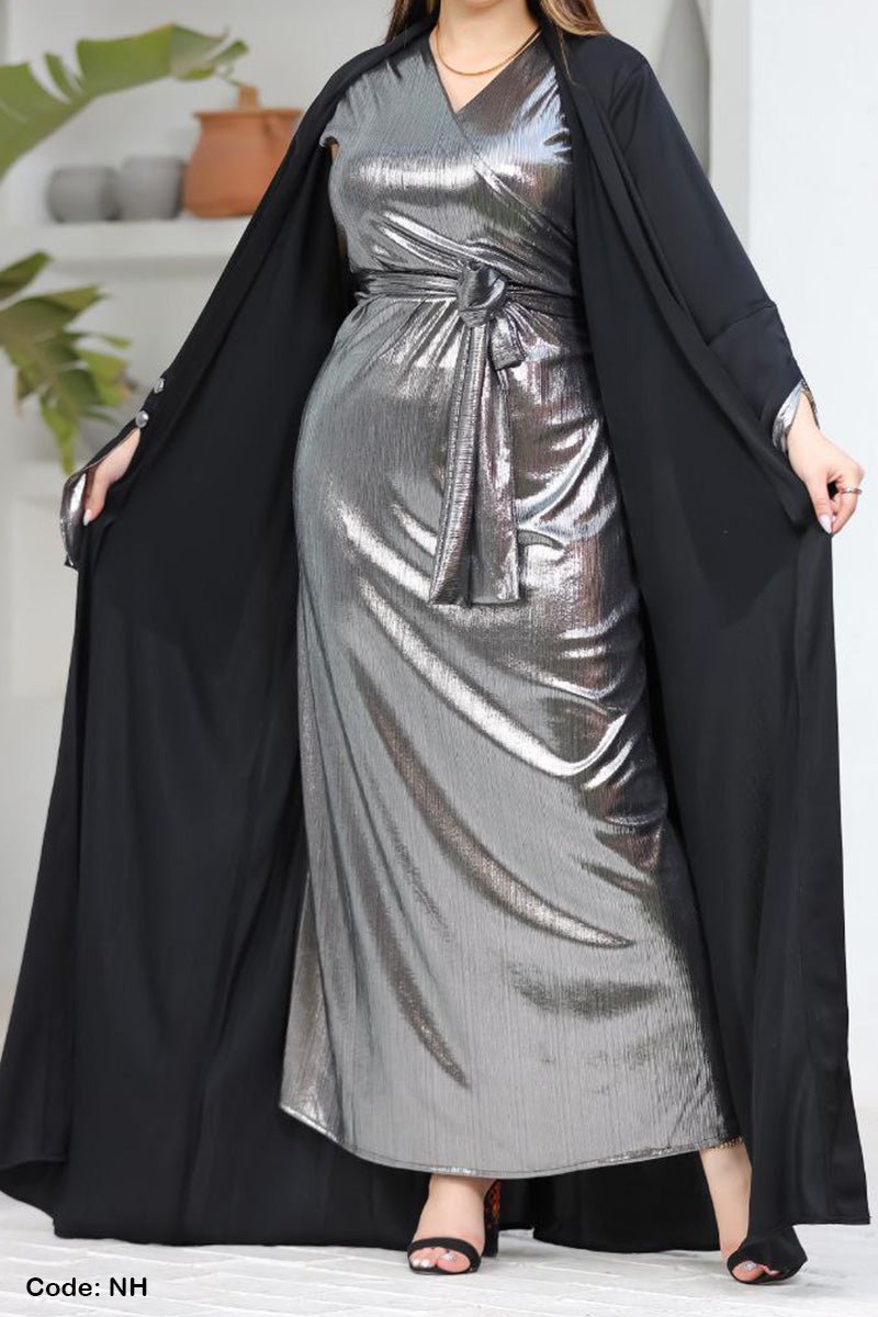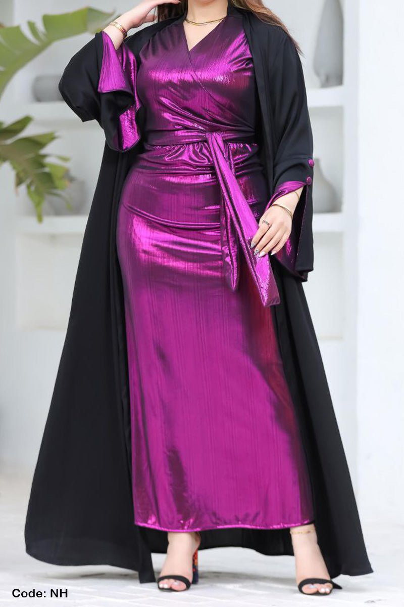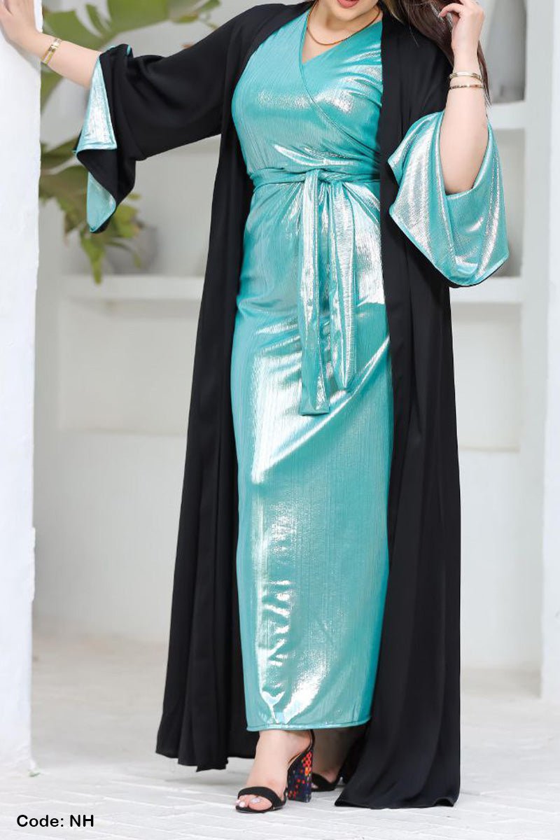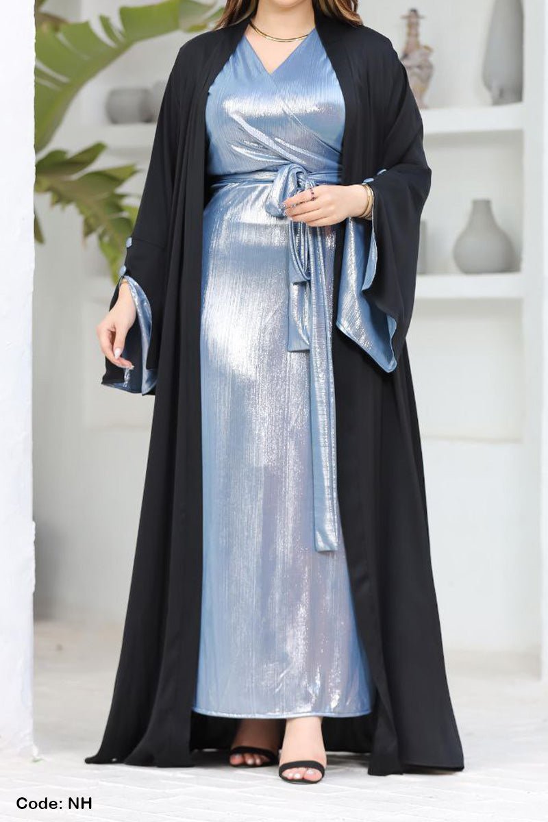- عباية قطعتين مكونة من بيزك كت بخامة ديسكو لامعة وعباية حرير مفتوحة