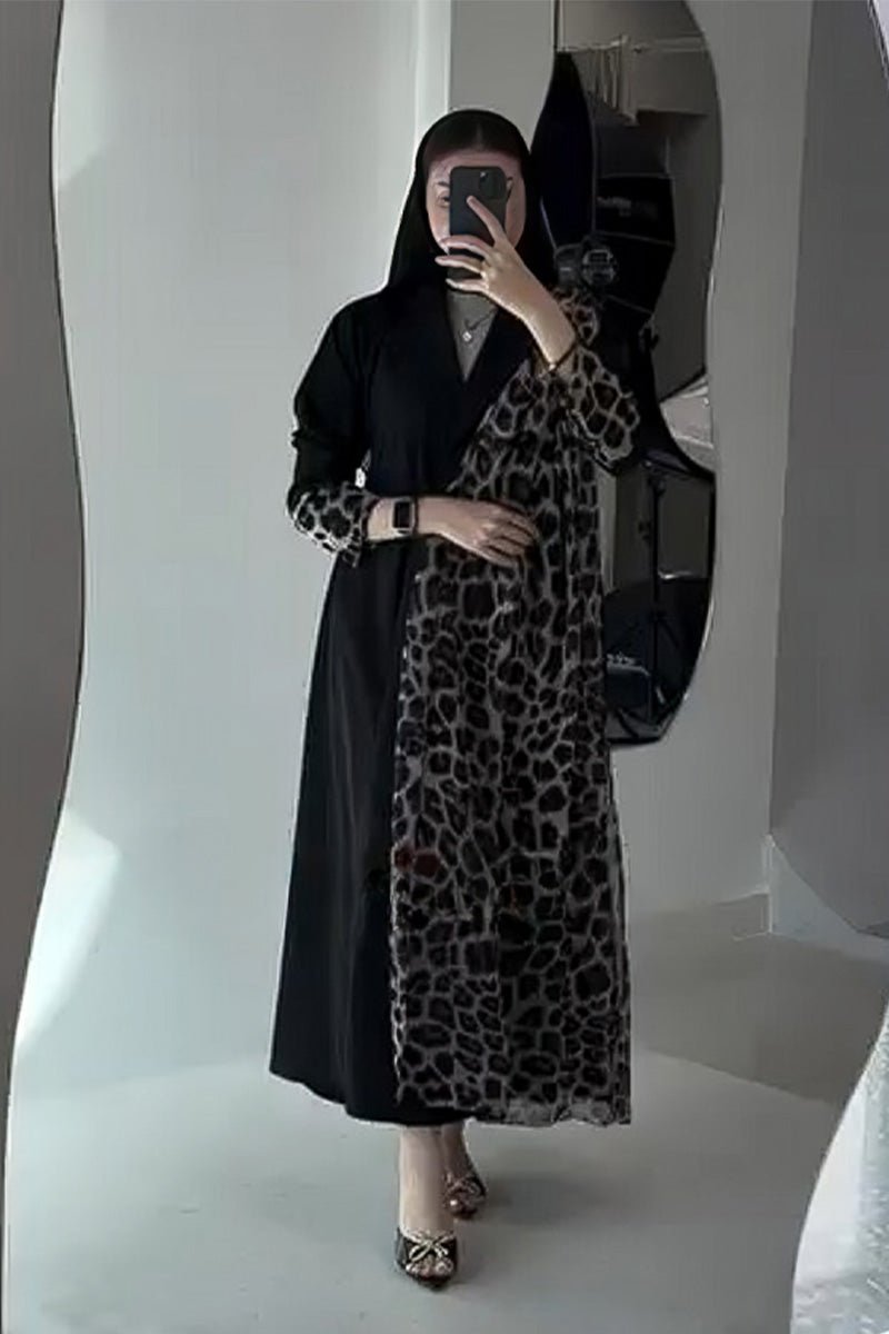 - مطعمة بخامة شيفون بنقشة التايجر علي احد جانبي العباية والاكمام