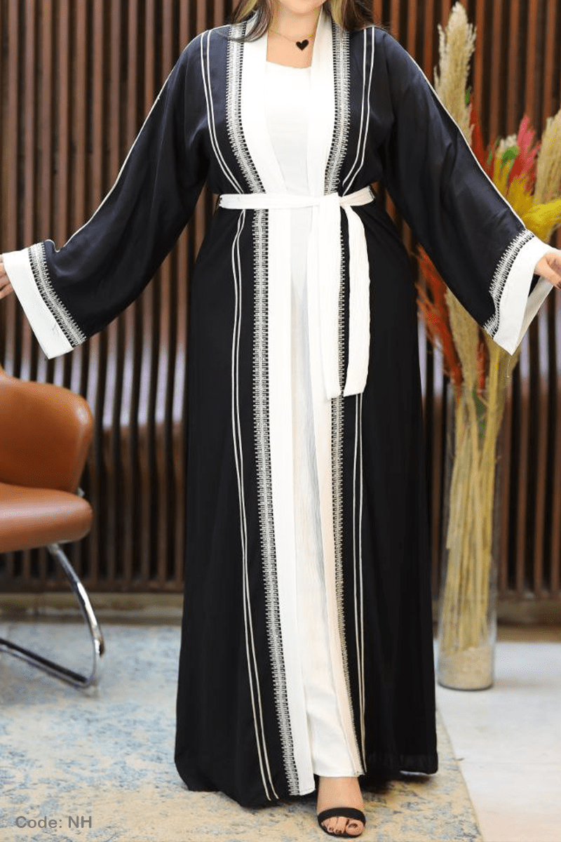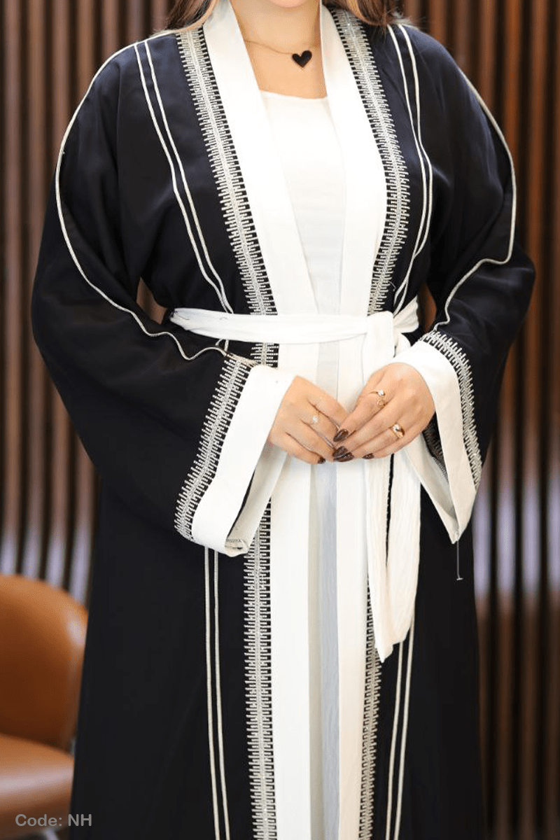 - عباية مفتوحة بكم لونها اسود وتحتها تلبيسة باللون الابيض