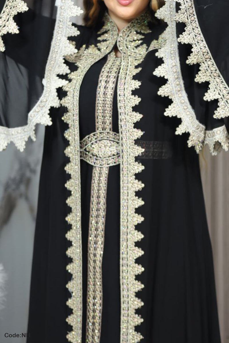 • التطريز : تطريز باستراس لامع وخيوط حرير ذهبية