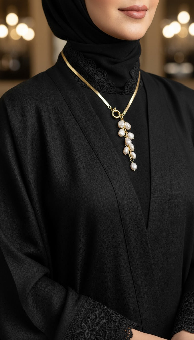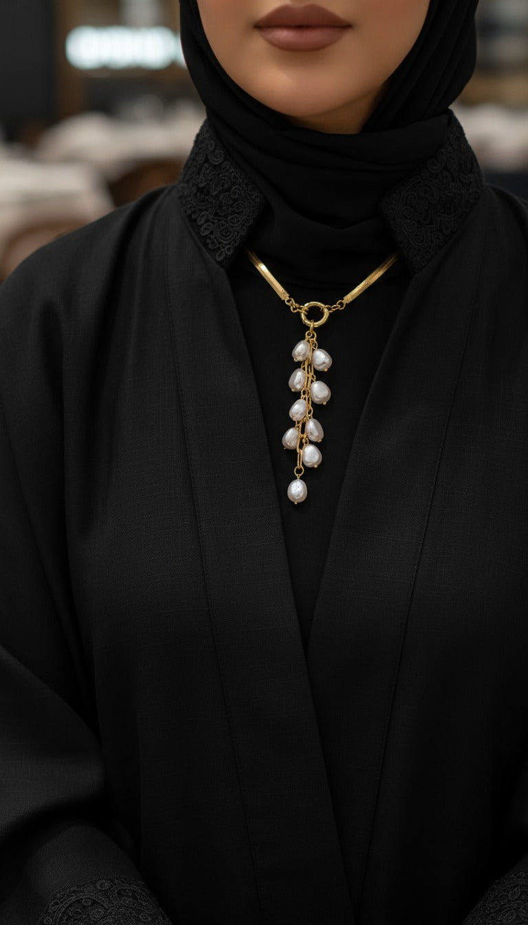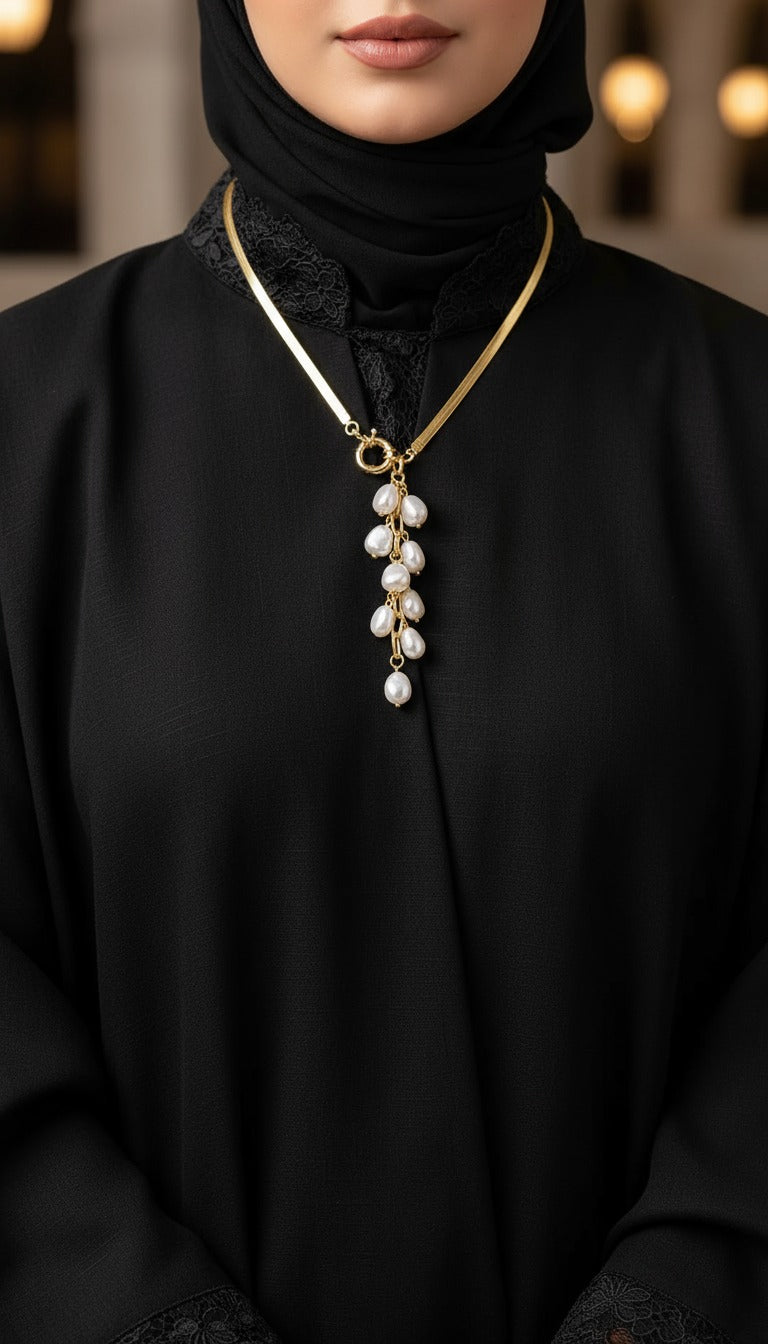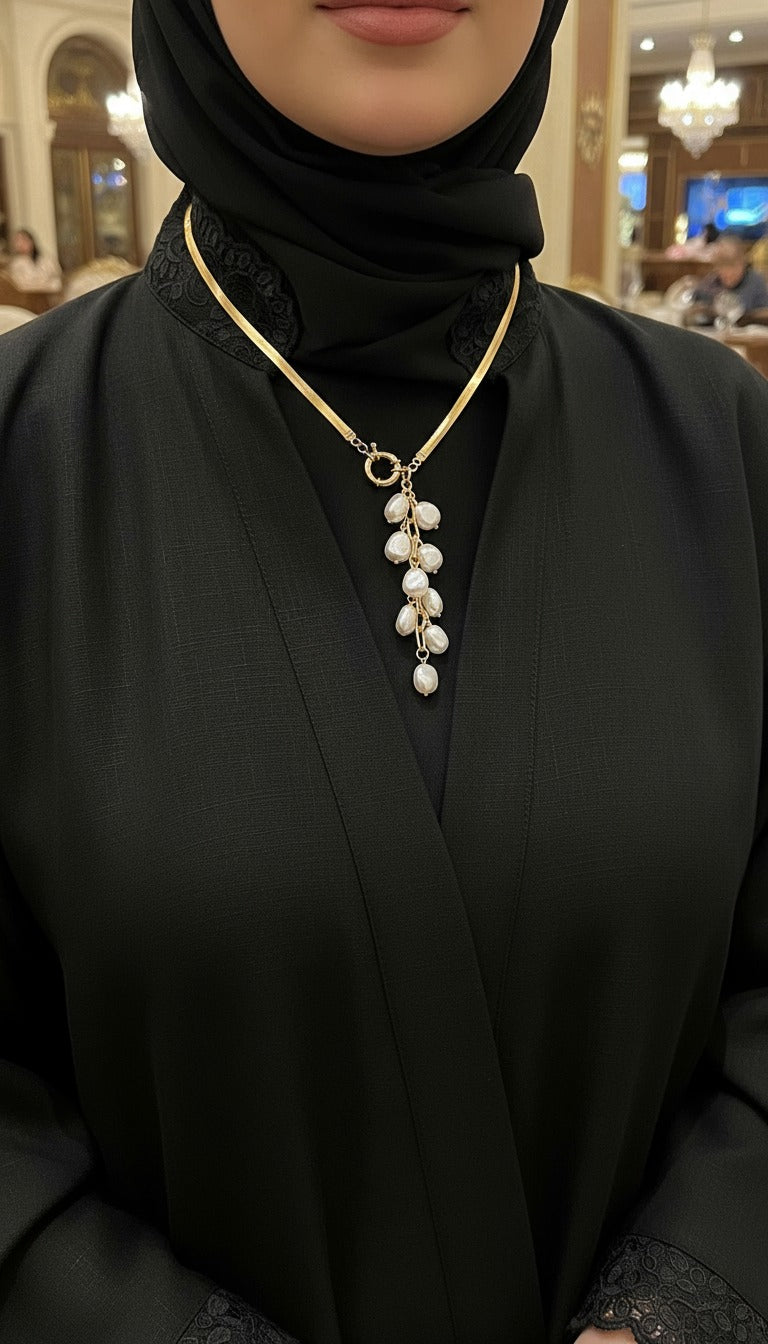 - عقد طويل من المعدن الذهبي مطعم بقفل منسدل منه احجار اللؤلؤ بشكل منسق